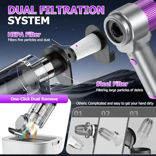 - Dual Filtration System: Effectively traps dust and allergens with replaceable HEPA filters and steel filter.