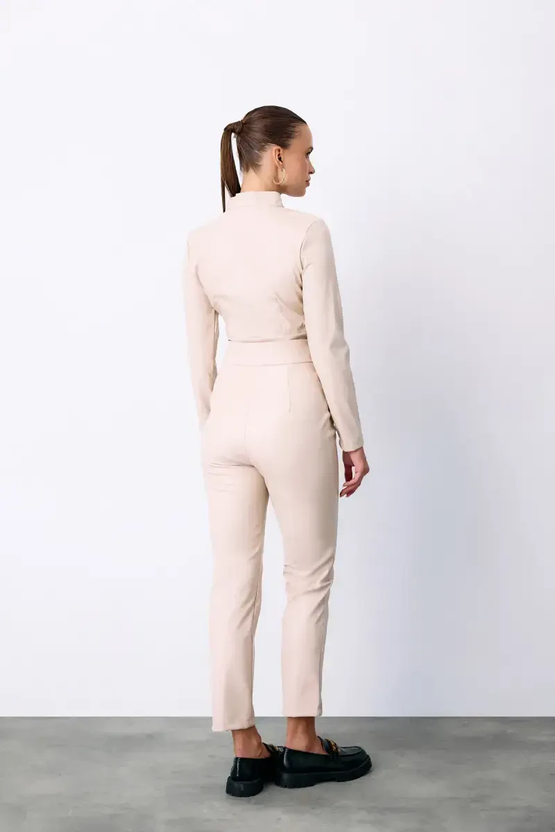 Fermuarlı Charm Terisi Bodysuit - Toshni tor jinsi shimlar, baland poshnalar va charm ko'ylagi bilan birlashtirishingiz mumkin. Kundalik uslub uchun siz uni erkaklar uslubidagi jinsi shimlar yoki denim shortilar bilan birlashtirishingiz mumkin.