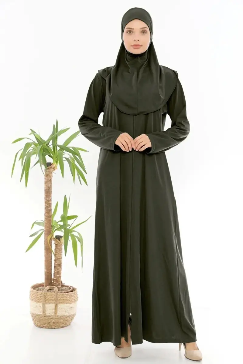 Fermuarlı Kayma Yapmaz Tek Parça Namaz Elbisesi-HAKİ