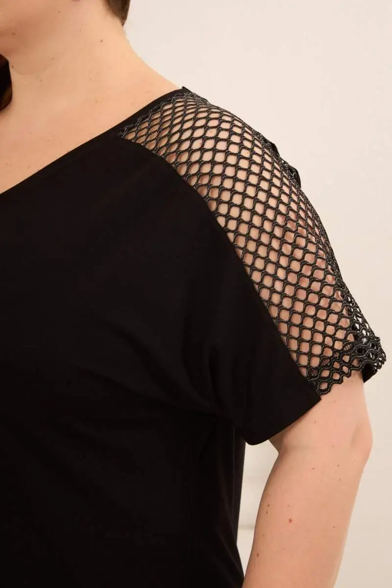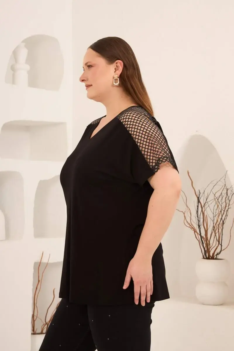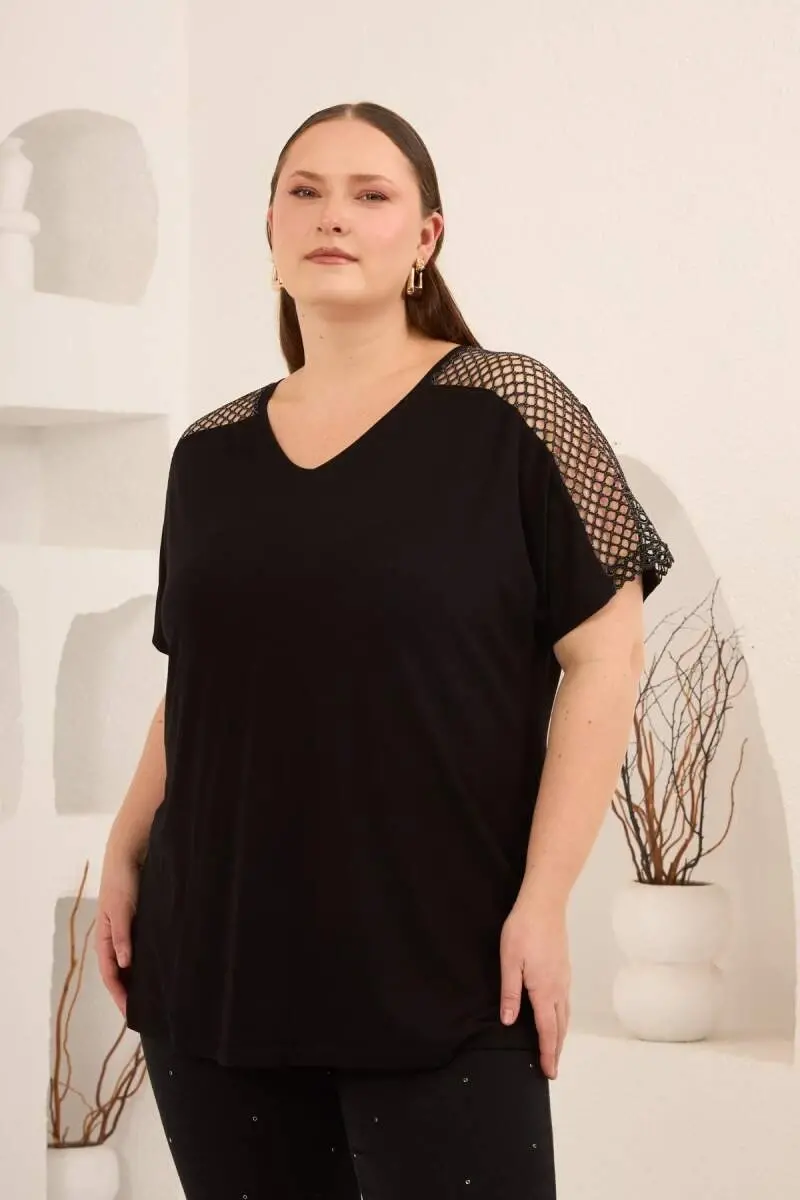 File Garnili Kadın Büyük Beden Tişört Siyah