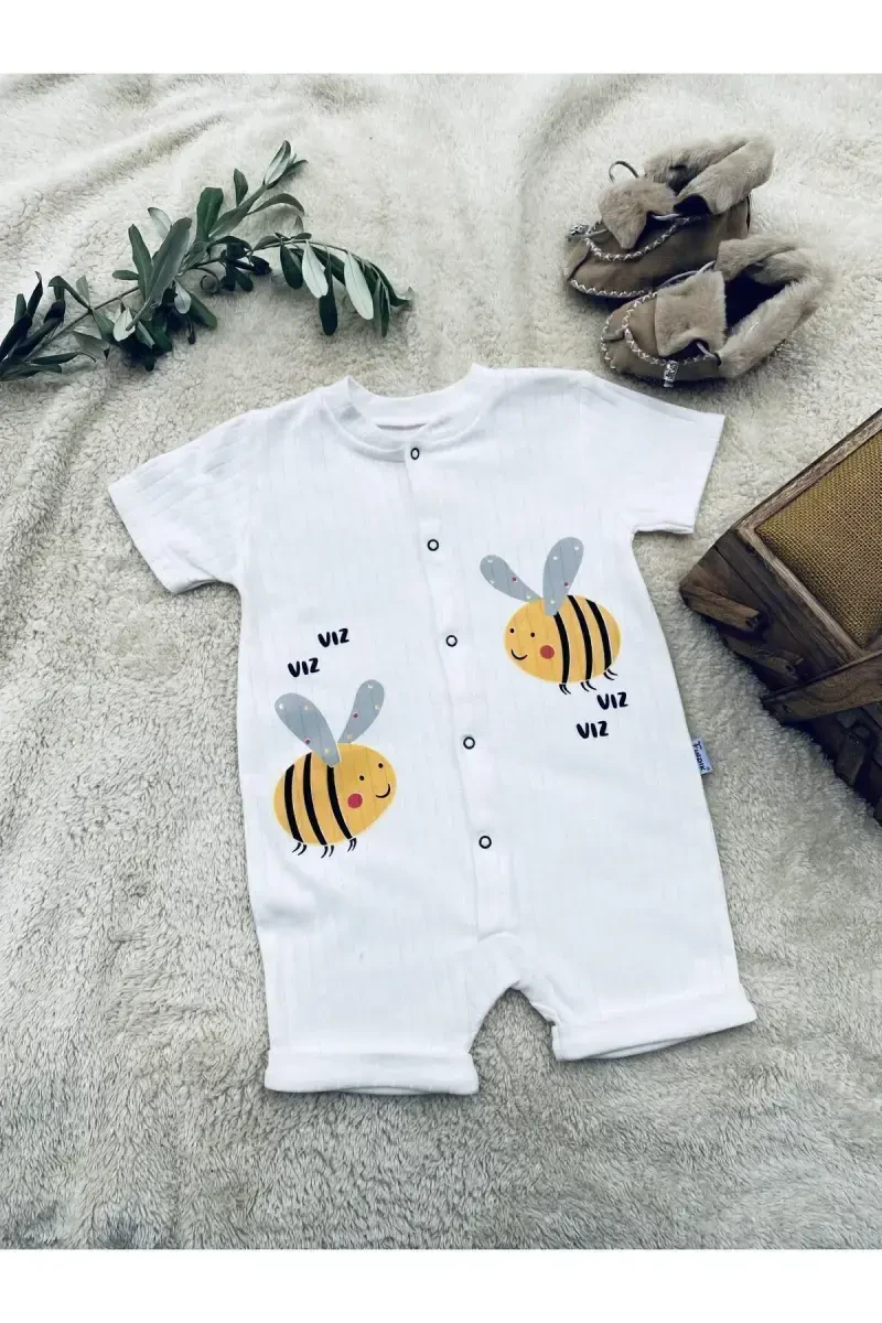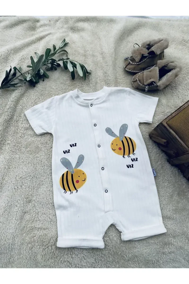 Arı Desenli Pamuk Şort Tulum | 0-12 Ay Bebek Tulum | Çıtçıtlı Kısa Kollu