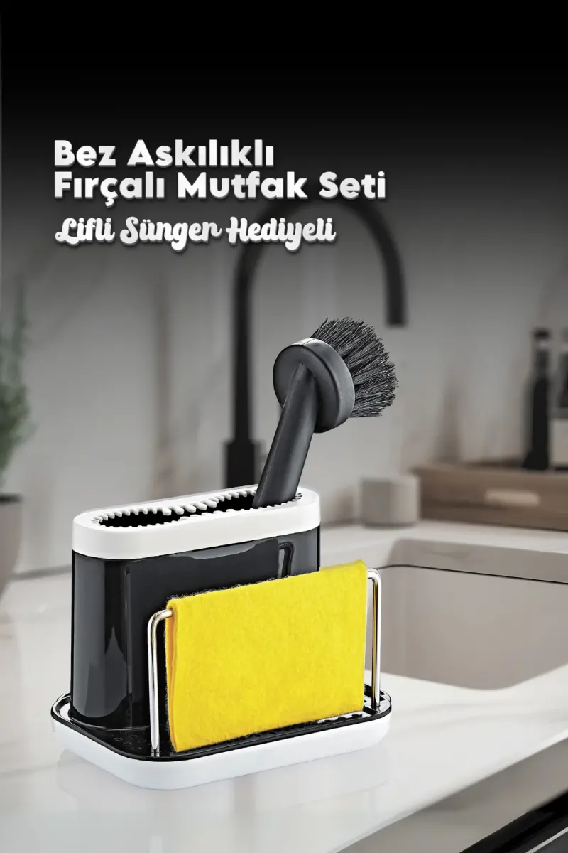 Fırçalı Telli Mutfak Seti Siyah- Standlı Plastik Mutfak Lifli Sünger Hediyeli-Siyah