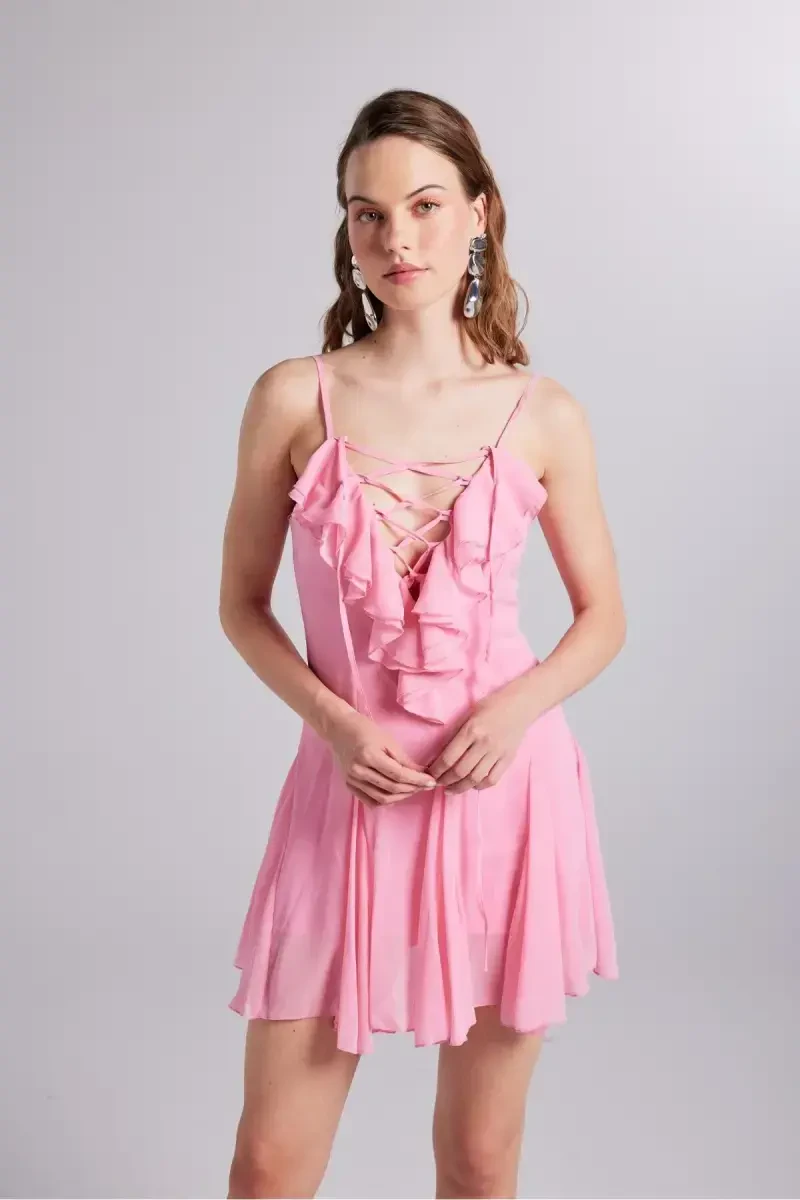 Add a romantic touch to your daily style with the Ruffle Detailed Chiffon Mini Sorento Dress in Pink-Pink. This stylish and comfortable dress, guaranteed by Holly Lolly, is set to become a staple in your wardrobe. Its standard length and elegant V-neck design offer both comfort and style, providing a comfortable wearing experience throughout the day. The A-line silhouette gently hugs your body, creating a feminine look without restricting your freedom of movement. The long sleeves make it an ideal choice for transitional seasons, allowing you to adapt to any environment with different combinations. With its plain pattern, this dress offers a simple and elegant look, while the ruffle details add movement and vibrancy. These delicate details add a romantic touch to the dress, elevating your style. The zippered closure provides practical use, while the non-sheer fabric ensures you feel confident and comfortable all day long. The standard sleeve type and regular fit offer a comfortable fit for all body types. The 100% polyester material composition guarantees the dress's durability and longevity. The chiffon weave type makes it an ideal choice for summer months with its lightness, while its thin structure keeps you cool. This allows you to stay comfortable without sacrificing your elegance even in hot weather. This dress, belonging to the business collection, strikes a perfect balance between functionality and style. Suitable for both daily use and special occasions, this dress is a versatile piece that can adapt to any environment. The Ruffle Detailed Chiffon Mini Sorento Dress in Pink-Pink, with its design appealing to all age groups, is set to become the most loved piece in your wardrobe. You can reflect your own style by combining this dress with different accessories and shoes, and you can always look stylish and unique. Remember, the most important detail that completes your style is choosing pieces that you feel comfortable and confident in. Attract attention in any environment by achieving both a stylish and comfortable look with the Ruffle Detailed Chiffon Mini Sorento Dress in Pink-Pink.