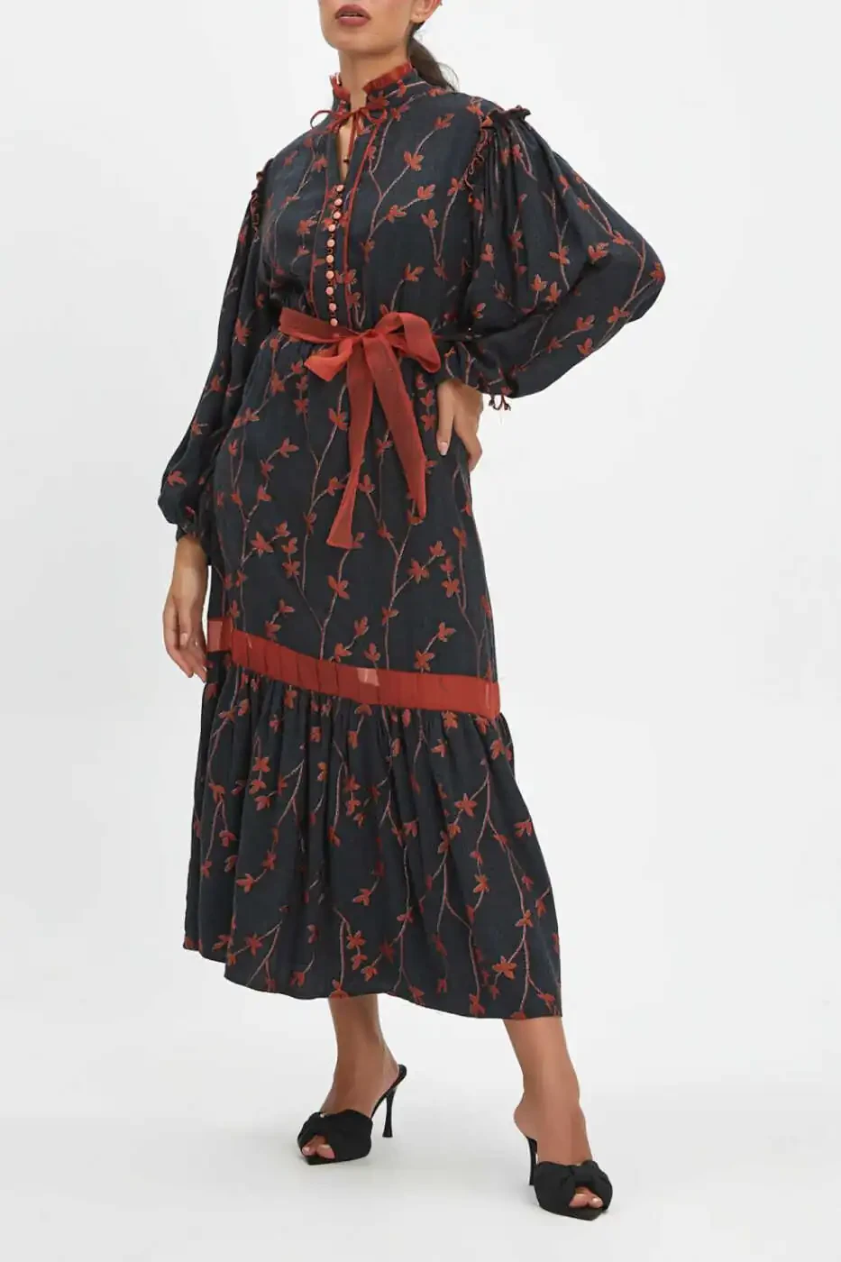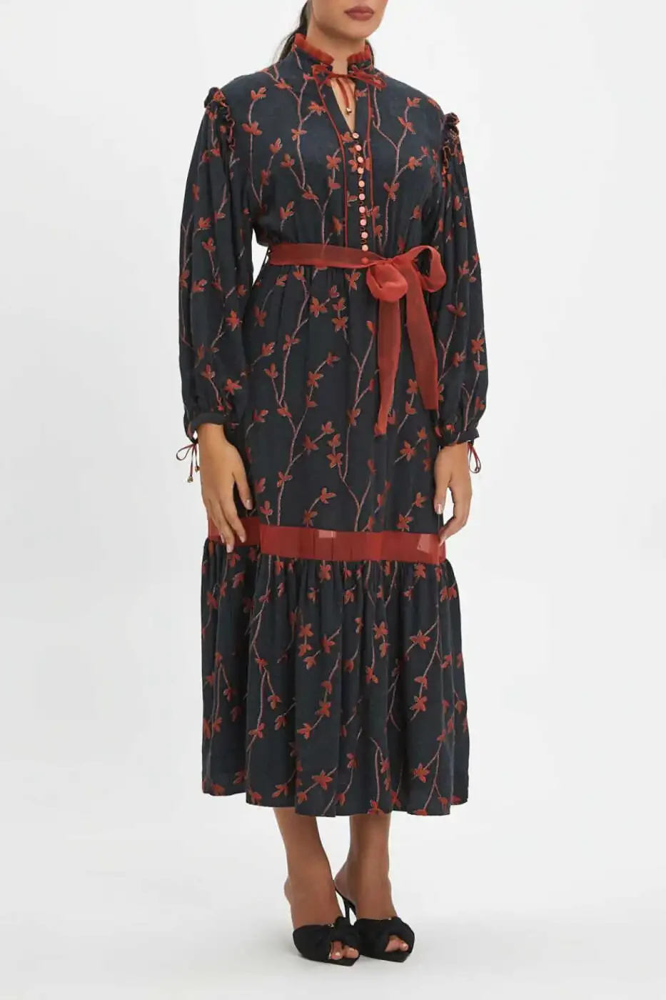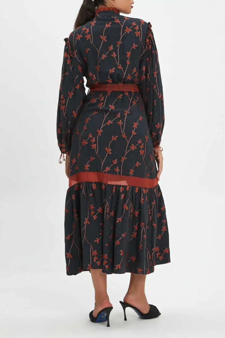 Fırfırlı Çiçek Desenli Düğmeli Nakış Detaylı Midi Elbise