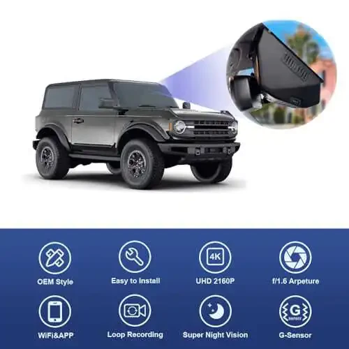 The Fitcamx 4K Dash Cam is designed to blend seamlessly with the interior of your Ford Bronco. Its OEM look integrates seamlessly with your vehicle's aesthetic.