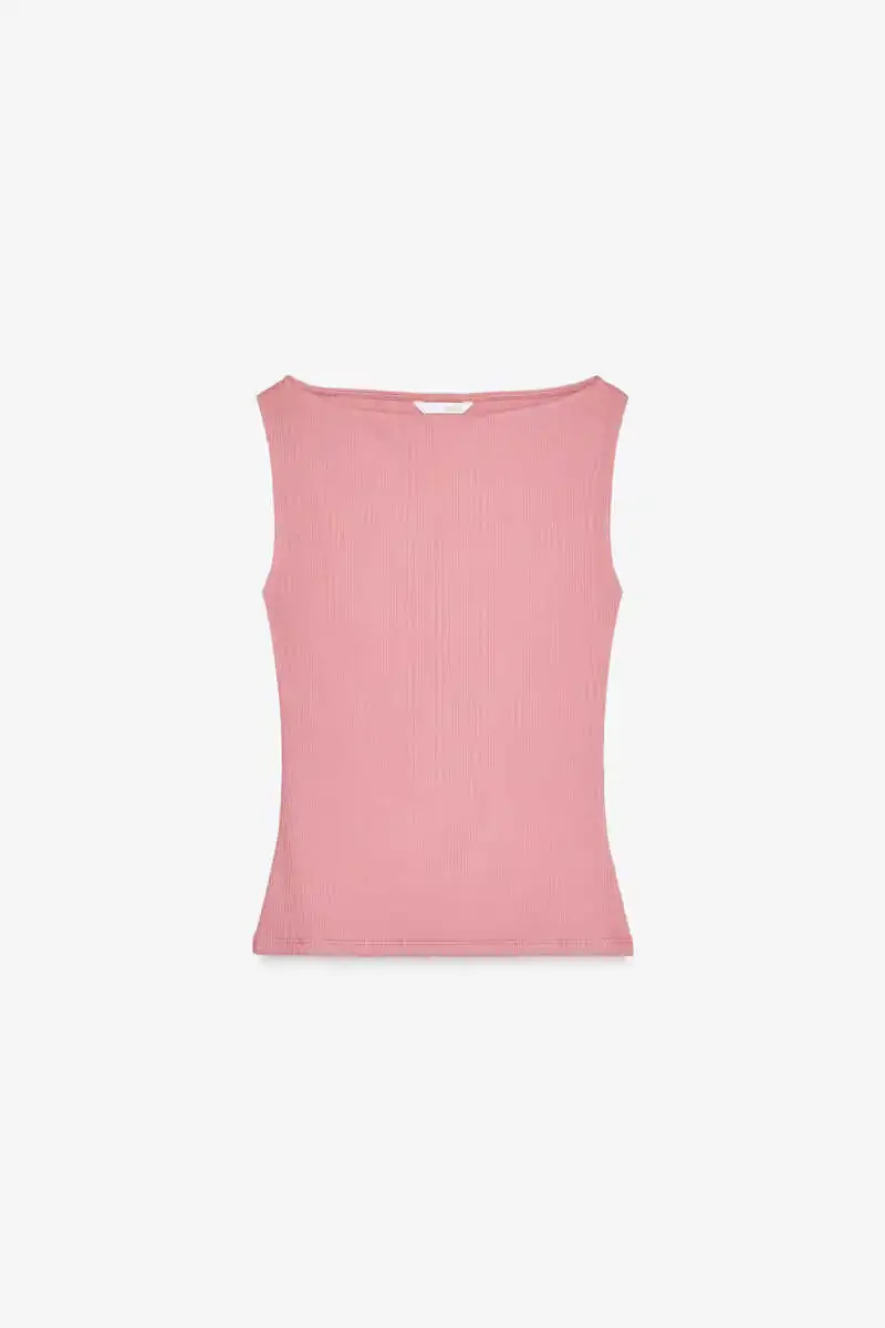 FITILLI, TOP, Pudra pembasi, slim fit, qayiq yoqa, yengsiz, paxta, nafis, shiq, qulay