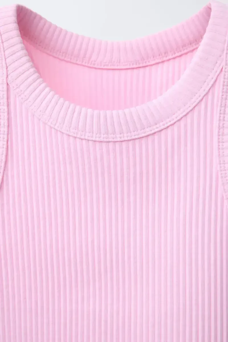 Bring the energy and comfort of summer to your wardrobe with the RIBBED SWIMMER T-SHIRT-Pink. This stylish and comfortable t-shirt is an ideal choice to accompany you during both sports and daily activities in warm weather. The crew neck offers a modern and elegant look, while the sleeveless design does not restrict your freedom of movement. Although designed specifically for swimming training and beach activities, it can also be preferred for daily use with different combinations thanks to its elegance and comfort. The ribbed texture adds a different dimension to the t-shirt, while ensuring it fits nicely on the body. The breathable structure of the cotton fabric helps you stay cool and dry all day long. The metallic appliqués at the hem of the t-shirt add a modern and eye-catching touch to the design, while completing your style. Metallic details make the t-shirt more special by moving it away from ordinariness. The RIBBED SWIMMER T-SHIRT-Pink is an excellent option for women who want to be both stylish and do not want to compromise on comfort. The pink color reflects the vitality and energy of summer, while it can be easily combined with different colors. Whether you want to achieve a sporty look with shorts or create a more stylish style with skirts, this t-shirt will accompany you in any case. You can create different styles by combining it with jeans in daily use, leggings or shorts while doing sports. In addition, this t-shirt, which you can also use as a bikini top on the beach, will be one of the indispensable pieces of your summer wardrobe. The RIBBED SWIMMER T-SHIRT-Pink is an excellent option to accompany you in the summer months by offering both elegance and comfort. You should definitely try this t-shirt to refresh your wardrobe and capture the energy of summer. Take your style one step further with the sparkle of metallic details and the difference of ribbed texture.