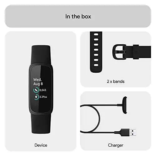Комплект поставки: Fitbit Inspire 3 доступен в цветах Midnight Zen / Black с браслетами малого и большого размера.