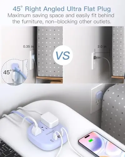 Say goodbye to outlet chaos with the Flat Plug Power Strip! This 7-in-1 desktop charging station converts a single outlet into 3 AC outlets, 2 USB-A ports, and 2 USB-C ports, allowing you to charge up to 7 devices simultaneously. You can use it for your phone, laptop, tablet, headphones, or cameras without needing multiple adapters. It's a must-have desktop accessory for college dorms, home, office, bedroom, kitchen, cruises, and travel.Experience fast charging with the added 2 USB-C ports, perfect for Apple enthusiasts. The USB-C port can provide up to 5V/3A charging, while the 2 USB-A ports offer up to 5V/2.4A charging. The total output of all USB ports is 5V/4.5A, 22.5W, which means 30% faster charging compared to other 15W power strips. This excellent USB charging station will be the best choice for your office.With its ultra-thin 0.35-inch flat plug and 45-degree right-angle design, it's much slimmer than traditional plugs. It easily adheres to the wall and can be hidden behind furniture, preventing outlet and space wastage. The 3mm thick braided extension cord is made of pure copper with better current carrying capacity (15A). The braided power cord does not deform easily, is durable, and safer.Thanks to its compact and lightweight design, it can be easily carried on airplane trips, business trips, or vacations. Especially on cruises where surge protection-free outlets are required, this small cruise power strip is a must-have accessory. Its surge protection-FREE design makes it ideal for cruise travel.Our product is ETL and FCC approved. High-quality components provide fire resistance up to 1382℉ and protection against over-current/over-charge/short-circuit/over-heating. It keeps your electrical appliances safe.