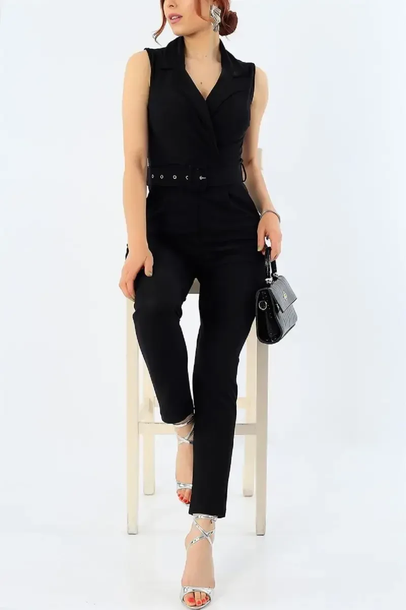 Elegant black formal jumpsuit with a stylish jacket collar and belt detail, made of flexible fabric.Product DescriptionDazzle on your special occasions with the Flexible Fabric Jacket Collar Belt Gifted Slim Fit Black Formal Jumpsuit, which offers both elegance and comfort. This jumpsuit stands out with its modern design and flawless details. Thanks to its flexible fabric, it offers comfortable use all day long, while its body-hugging cut creates an elegant silhouette. The jacket collar detail takes the jumpsuit's elegance to the next level, while the accompanying belt accessory helps you achieve a fitter look by emphasizing your waist. The slim fit cut creates a modern and trendy style, while making your legs look longer when combined with heels. This jumpsuit, which you can choose for a special occasion or a stylish dinner, will be an indispensable part of your wardrobe. This formal jumpsuit, which carries the nobility and elegance of black, will allow you to express your style in any environment. While the flexible fabric of the product does not restrict your freedom of movement, its high-quality stitching offers long-lasting use. The belt detail allows you to personalize the jumpsuit and reflect your style, while the jacket collar combines classic and modern lines. This jumpsuit is not only stylish but also a practical choice. Its easy-to-wear and remove structure saves you time, while its non-iron fabric helps you look well-groomed at all times. Enjoy being both comfortable and stylish with the Flexible Fabric Jacket Collar Belt Gifted Slim Fit Black Formal Jumpsuit.Product Features* Flexible fabric structure provides comfortable use throughout the day.* Jacket collar detail offers a stylish and sophisticated look.* Belt accessory emphasizes your waist and creates a fitter silhouette.* Slim fit cut creates a modern and trendy style.* Black color exudes a noble and elegant stance in any environment.* High-quality stitching provides long-lasting use.* Easy to wear and remove design offers practical use.* Non-iron fabric ensures a well-groomed appearance at all times.* Different size options are available.* Ideal for special invitations and stylish dinners.* Creates an elegant silhouette with its body-hugging cut.* Flexible fabric that does not restrict freedom of movement.* Customizable design with belt detail.* Combines both classic and modern lines.Additional InformationThe fabric content and washing instructions of the product are indicated on the label. Please read the label carefully. The model is wearing size S. There may be slight differences in the product color due to the light and environment used in the shooting. Follow the specified washing instructions to use the product for a long time.