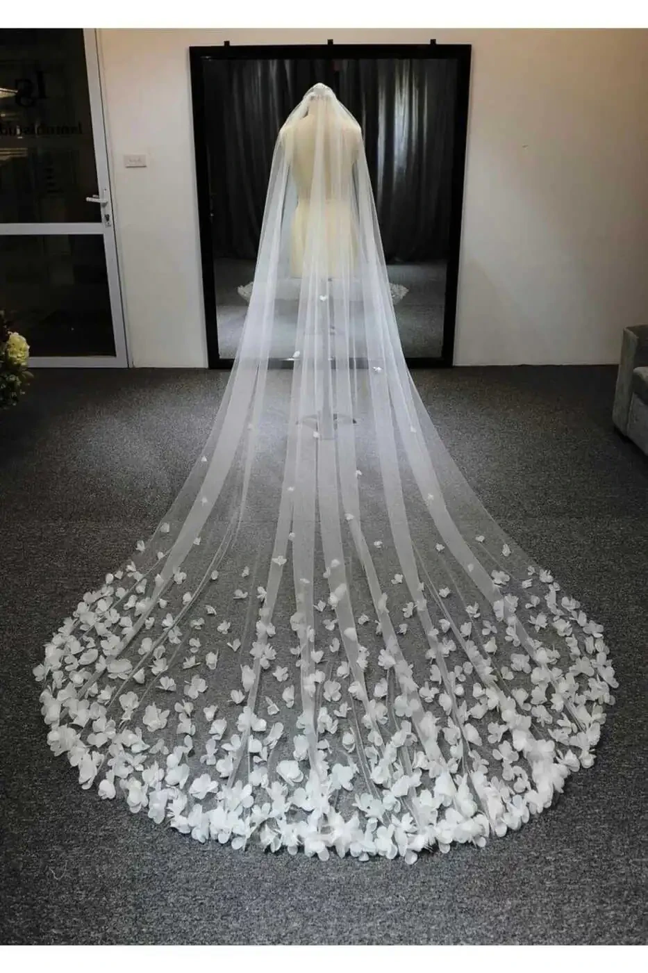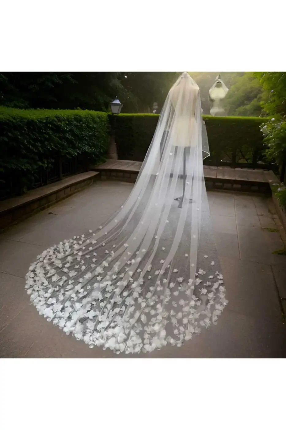 The Flower Veil Off-White 3D Flower Veil 300 Cm Comb Long Veil Cathedral Veil White is an accessory that will add elegance and romance to your wedding dress style. This veil, meticulously prepared with every detail, will help your wedding day dreams come true.