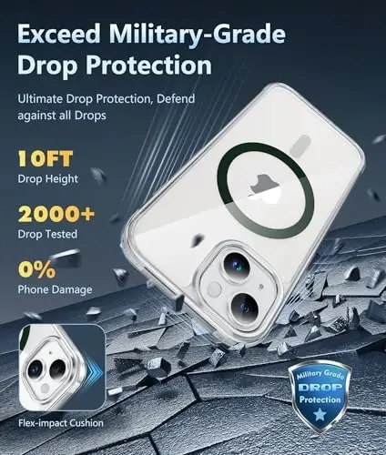 【Strong Magnetic Attraction】Compatible for Magnetic chargers and other Qi Wireless chargers without signal influence. The iPhone 13 magnetic case has built-in 38 super N52 magnets. Its magnetic attraction reaches 2400 gf, which is almost 7X stronger than ordinary, therefore it won't fall off no matter how it shakes when you are charging 【Crystal Clear & Never Yellow】Using high-grade Bayer's ultra-clear TPU and PC material, allowing you to admire the original sublime beauty for iPhone 14/13 while won't get oily when used. The Nano antioxidant layer effectively resists stains and sweat, keeping the case clear like a diamond longer than others 【10FT Military Grade Protection】Passed Military Drop Tested up to 10 FT. This iPhone 13 clear case backplane is made with rigid polycarbonate and flexible shockproof TPU bumpers around the edge and features 4 built-in corner Airbags to absorb impact, which can prevent your Phone from accidental drops, bumps, and scratches 【Raised Camera & Screen Protection】The tiny design of 2.5 mm lips over the camera, 1.5 mm bezels over the screen, and 0.5 mm raised corner lips on the back provides extra and comprehensive protection, even if the phone is dropped, can minimize and reduce scratches and bumps on the phone. Molded strictly to the original phone, all ports, lenses, and side button openings have been measured and calibrated countless times, and each button is sensitive and easily accessible 【Compatibility & Professional Support】 Only compatible for iPhone 13-14 Phones. We have enough confidence to provide you with quality products and services. Any concerns or questions about iPhone 13-14 Phone Case, please feel free to contact us