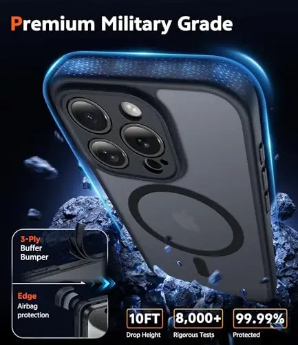 Strong Magnetic Charging: Fit for Magnetic chargers and other Wireless chargers. This iPhone 15 Pro Case has built-in 38 super N52 magnets. Its magnetic attraction reaches 2400 gf, which is almost 7X stronger than ordinary, therefore it won't fall off no matter how it shakes when you are charging. Aligns perfectly with wireless power bank, wallets, car mounts and wireless charging stand Tempered Glass Screen Protector: iPhone 15 Pro Phone Case with 1X screen protector, it can preserves the original touch sensitivity and HD clarity while providing exceptional protection against scratches and drops Camera Protection: Unique meticulously designed with Built-in camera cover. It prevents your iPhone 15 Pro Camera from any dust, sahatter, or sacratch. And the same camera cover color match with phone case, which looks more uniform Matte Translucent Back: The Phone Case iPhone 15 Pro uses high quality matte TPU and PC translucent material, refined and elegant beauty without covering the iPhone logo. The frosted surface provides a comfortable hand feel, and the Nano antioxidant layer effectively resists stains, sweat and scratches 14FT Military Grade Drop Protection: Our case for iPhone 15 Pro backplane is made with rigid polycarbonate and flexible shockproof TPU bumpers around the edge and features 4 built-in corner Airbags to absorb impact, which can prevent your Phone from accidental drops, bumps, and scratches