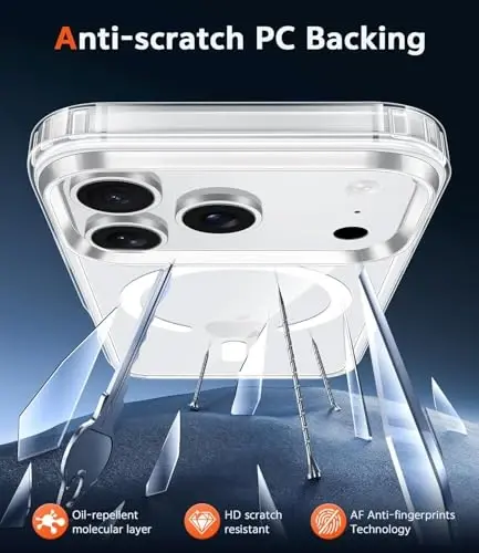 Strong Magnetic Attraction: Compatible for Magnetic chargers and other Qi Wireless chargers without signal influence. The iPhone 17 Pro magnetic case has built-in 38 super N52 magnets. Its magnetic attraction reaches 2400 gf Crystal Clear & Never Yellow: Using high-grade Bayer's ultra-clear TPU and PC material, allowing you to admire the original sublime beauty for iPhone 17 Pro while won't get oily when used. The Nano antioxidant layer effectively resists stains and sweat 10FT Military Grade Protection: Passed Military Drop Tested up to 10FT. This iPhone 17 Pro clear case backplane is made with rigid polycarbonate and flexible shockproof TPU bumpers around the edge and features 4 built-in corner Airbags to absorb impact Raised Bezels Protection for Camera Lens & Screen: The tiny design of 2.5mm raised lips over the camera, 1.5mm bezels over the screen, and 0.5 mm raised corner lips on the back provides extra and comprehensive protection Compatibility & Secure Grip: Only designed for iPhone 17 Pro 6.3 inch. Precise cut-outs allow easy access to all ports, buttons, cameras, sensors. This clear case can totally achieve a great grip feeling
