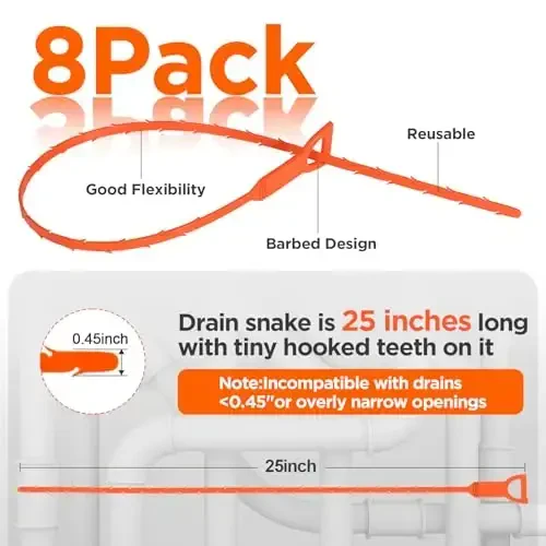Forlivese 8 dona 25 dyuymli lavabo iloni, lavabo tiqilishini tozalovchi, soch ushlagich asbobi, dush, oshxona lavabosi va hammom uchun moslashuvchan burama tozalagich bilan tanishing! Uyingizdagi tiqilish muammolariga chek qo'yadigan, amaliy va samarali yechimni taklif etamiz. Ushbu ko'p qismli paketda turli tiqilishlarni bartaraf etish uchun 8 dona bardoshli, 25 dyuymli lavabo tozalagich mavjud. Har bir lavabo ilonining kengligi 0,45 dyuymni tashkil qiladi, shuning uchun xarid qilishdan oldin lavabo teshigingiz ushbu o'lchamdan oshib ketishiga ishonch hosil qilishingiz kerak. Forlivese lavabo iloni yuqori sifatli va moslashuvchan ABS materialidan tayyorlangan. Ushbu material mahsulotning chidamliligini oshiradi, shu bilan birga quvurlar ichida oson harakatlanishini ta'minlaydi. Ko'p tishli qirralari tufayli ushbu tiqilishni tozalash moslamalari sochlarni, sovun qoldiqlarini va boshqa chiqindilarni quvurlaringiz va filtrlaridan bir zumda ushlaydi. Bundan tashqari, bu jarayonni sirtlarni chizmasdan amalga oshiradi. Foydalanish juda oson. Lavabo ilonining dastasi halqasini ushlab turing, lavabo teshigiga joylashtiring va tiqilishni bartaraf etish uchun 2-3 marta yuqoriga va pastga harakatlantirib aylantiring. Forlivese lavabo tozalagichi foydalanish paytida qo'llaringizni siqmaydi va ish tugagandan so'ng uni bexavotir tozalash mumkin. Ekologik toza va qayta ishlatilishi mumkinligi ushbu mahsulotni boshqa lavabo ochish usullaridan ajratib turadi. Kimyoviy tozalagichlarga ajoyib alternativ bo'lib, oshxona lavabolari, hojatxonalar, lavabolar, vannalar va suv oqadigan joylar kabi turli sohalarda xavfsiz tarzda foydalanish mumkin. Forlivese lavabo tiqilishini tozalovchi qayta ishlatiladigan va qayta ishlanadigan xususiyatlari bilan ham amaliy, ham tejamkor! Keng qo'llash doirasi tufayli Forlivese lavabo iloni oshxona lavabolari, hojatxonalar, lavabolar, vannalar va kanalizatsiya uchun ajoyib tozalash vositasidir. Moslashuvchan tuzilishi tufayli u ko'pchilik tiqilishlar sodir bo'ladigan P-qopqonlarda ham oson harakat qilishi mumkin. Endi tiqilib qolgan lavabolardan aziyat chekishga hojat yo'q. Forlivese bilan hayotingizni osonlashtiring!