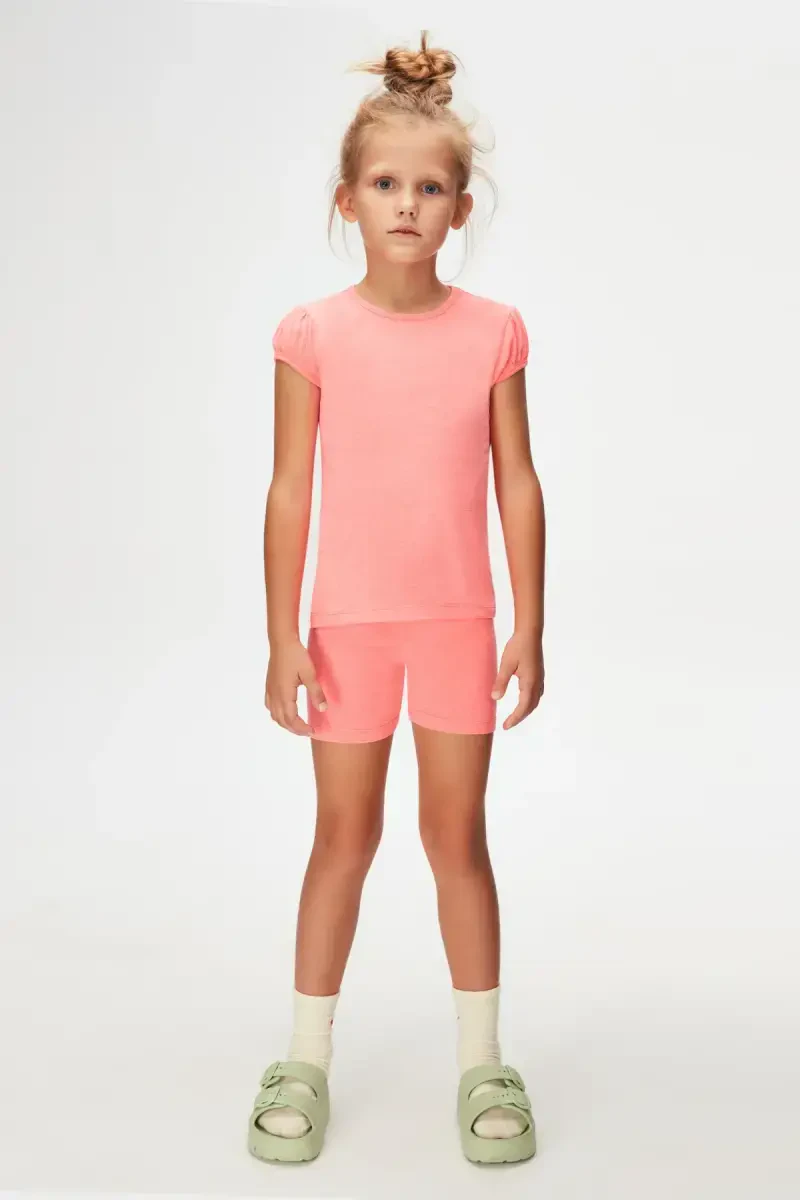 Fosfor Fuchsiya Asosiy Qiz Bolalar Nol Bo'yin Tarvuz Yengli Futbolka-NEON FUCHSIA