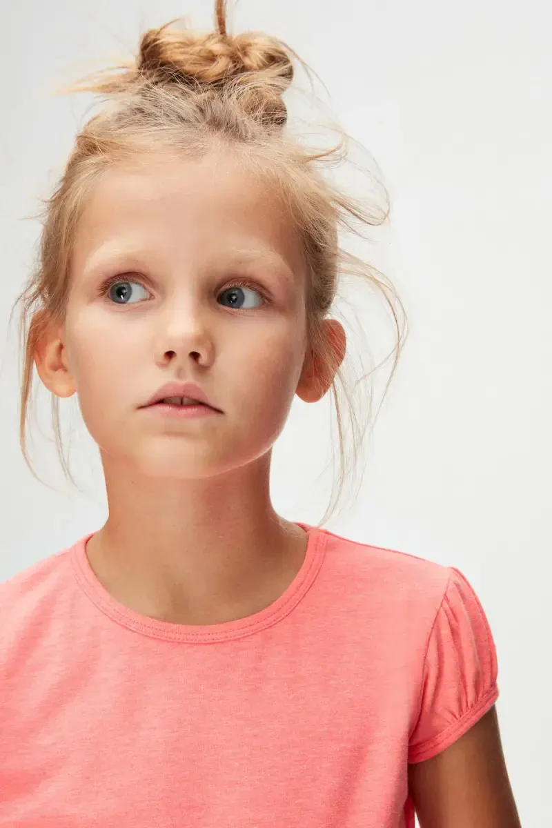 Qiz bolalar futbolkasi, fosforli fuchsiya, Lovetti, tarvuz yengli, dumaloq yoqali, yozgi futbolka, trikotaj mato, asosiy futbolka, kundalik kiyim, bolalar modasi