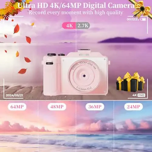 4k dijital kamera, fotoğraf makinesi, vlogging kamera, wifi kamera, 64mp kamera, otomatik odaklama, 16x zoom, selfie lens, 64gb kart, kompakt kamera, seyahat kamerası, youtube video çekimi, vintage kamera