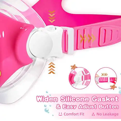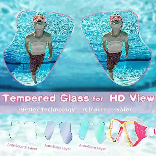 【Safe Tempered Glass Lens】The toughened glass lenses of this kids swim goggles have a higher clarity than plastic lenses and do not distort the vision, it is pool beach universal and no coating peeling problem. The lenses are equipped with an explosion-proof film, which enables the glass to remain in one piece when it is shattered by impact and does not splash, ensuring safety in use. 【180° Panoramic HD View】The ultra-wide flat lenses of the kids goggles provide kids with a panoramic clear view, no distortion of vision even in the afterglow on both sides, allowing kids to have a super clear visual experience underwater and make the swimming process safer. 【Nose Friendly Cover】This swimming goggles for kids youth 3-14 design with a soft nose cover, it can reduce the water pressure on the eyes during swimming and diving through exhaled breath from the nose, it's also a friendly design for kids who don't know how to stop breathing through the nose in the water, say goodbye to nose choking. 【Widen Soft Silicone Skirt】The wide and soft silicone skirt of the water pool goggles can stay firmly on kids' face, leaving no gaps and creating a perfect watertight seal, while also reducing the pressure on kids' face through the wide contact area, giving kids the ultimate comfort and long hours of wear without discomfort. 【Easy-To-Adjust Button】Freela goggles for kids boys girls 3-14 are designed with an easy adjustment button on the side, which can be pressed to quickly adjust the tightness of the headband. The part of the headband that is in contact with the button has a non-slip design that keeps the headband from sliding around, so it's no need to worry about the goggles coming loose during swimming.