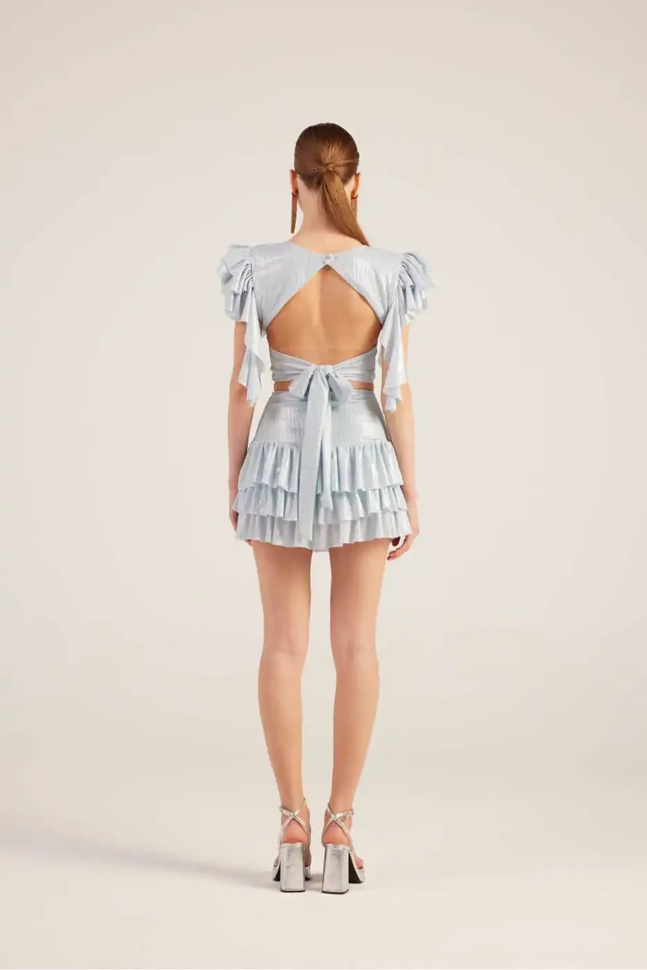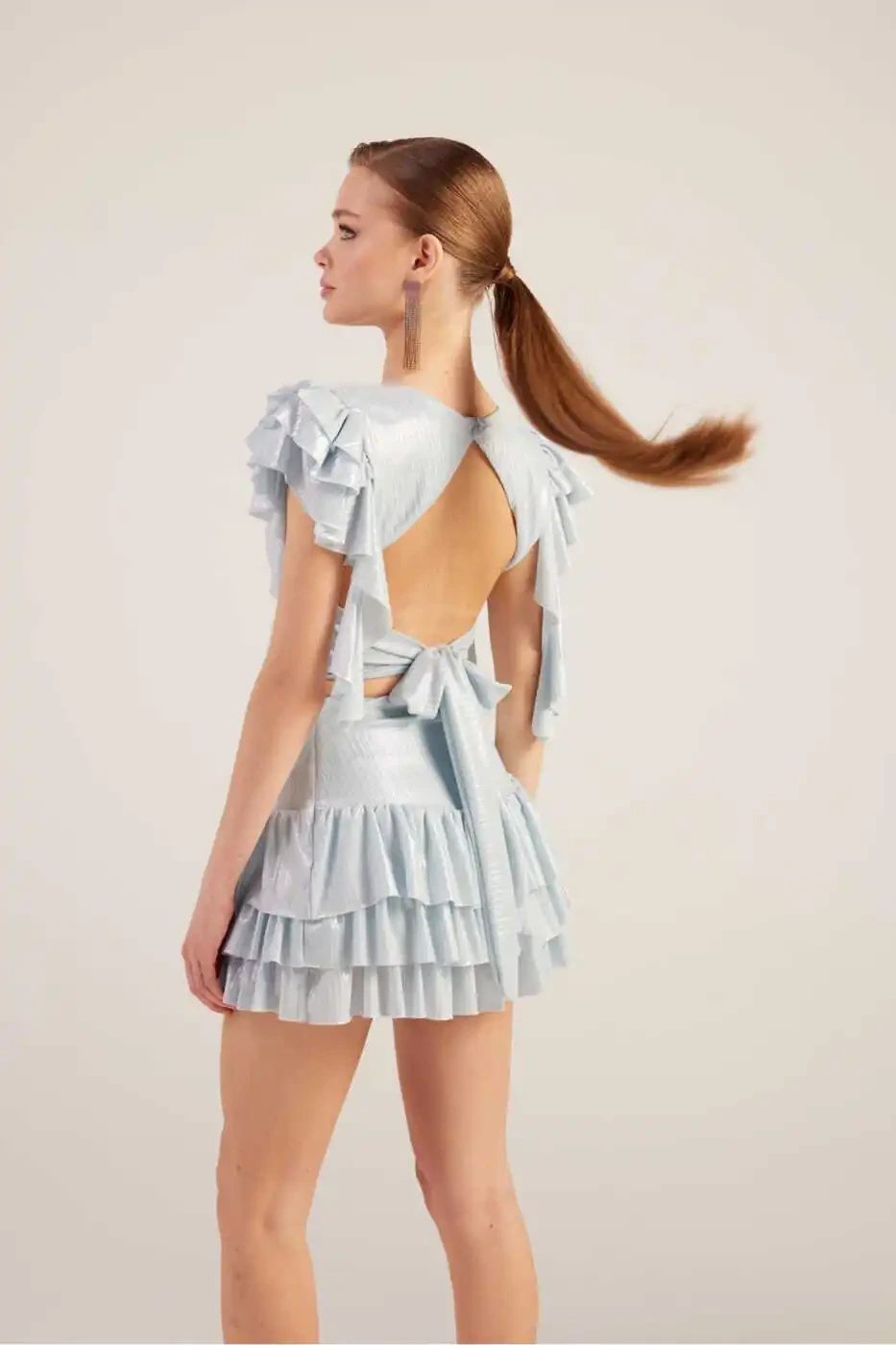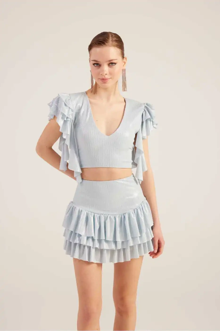 Bring the energy of summer to your wardrobe with the Ruffle Detail Skirt Blouse Nana Set Blue-Blue! This stylish and eye-catching set is offered with the assurance of Holly Lolly. This set, which stands out with its shiny fabric and striking ruffle details, offers both comfort and elegance. Whether at a special event or in daily use, it allows you to make a difference in any environment. You can achieve a modern and trendy look with its ruffled-sleeved, open-back crop blouse and ruffled mini skirt. Reflecting the spirit of summer with the vibrancy of the blue color and the dynamism of the ruffles, this set will add energy to your style. Product stocks are limited and offered at a promotional price. Do not miss this unique set and bring a new breath to your style! Ruffle details add a feminine touch to the set, while the crop blouse and mini skirt combination create a modern silhouette. Whether you make a stylish combination with heels or create a more comfortable style with sandals, you will always be eye-catching with the Ruffle Detail Skirt Blouse Nana Set. The X size option on the model is an option that can be used easily by everyone by adapting to different body types. Order this set now, which will be an indispensable part of your wardrobe, and enjoy the summer! Moreover, if you do not like the product, you can take advantage of the free return opportunity within 15 days. This special design, offered with Holly Lolly quality, is the most fun way to reflect your style! With this set, you will always look perfect at summer invitations, special occasions or when you just want to complete your daily elegance. This combination, which dazzles with its ruffle details and shiny fabric, is a candidate to be the most favorite piece of your wardrobe. With the energy of the blue color and the originality of the design, you will make a difference in every environment and reflect your style in the best way. Don't miss it, order now!