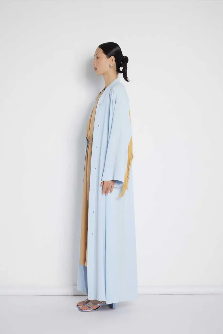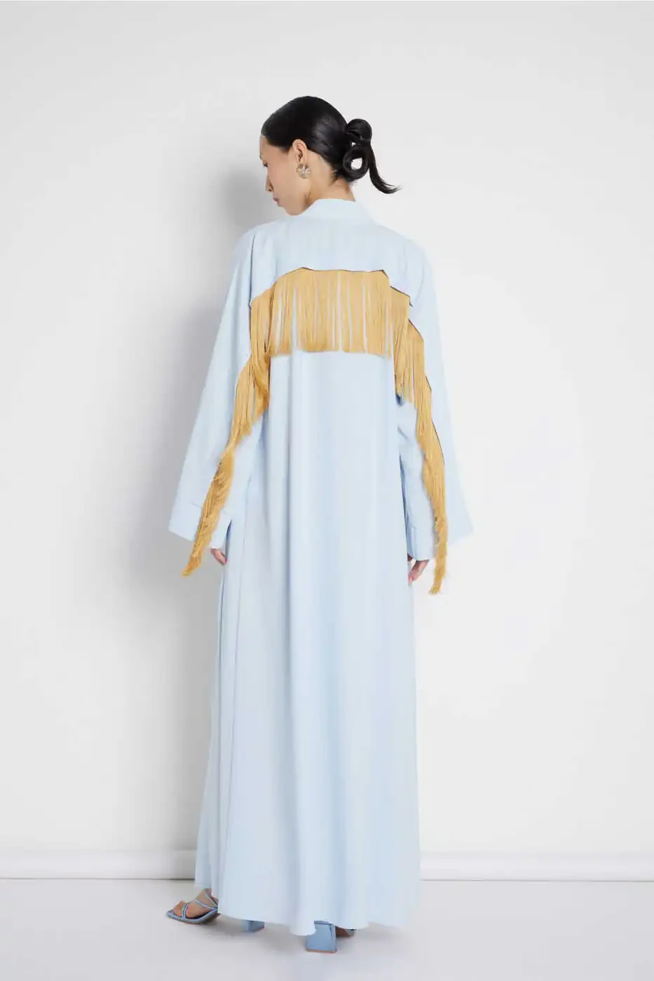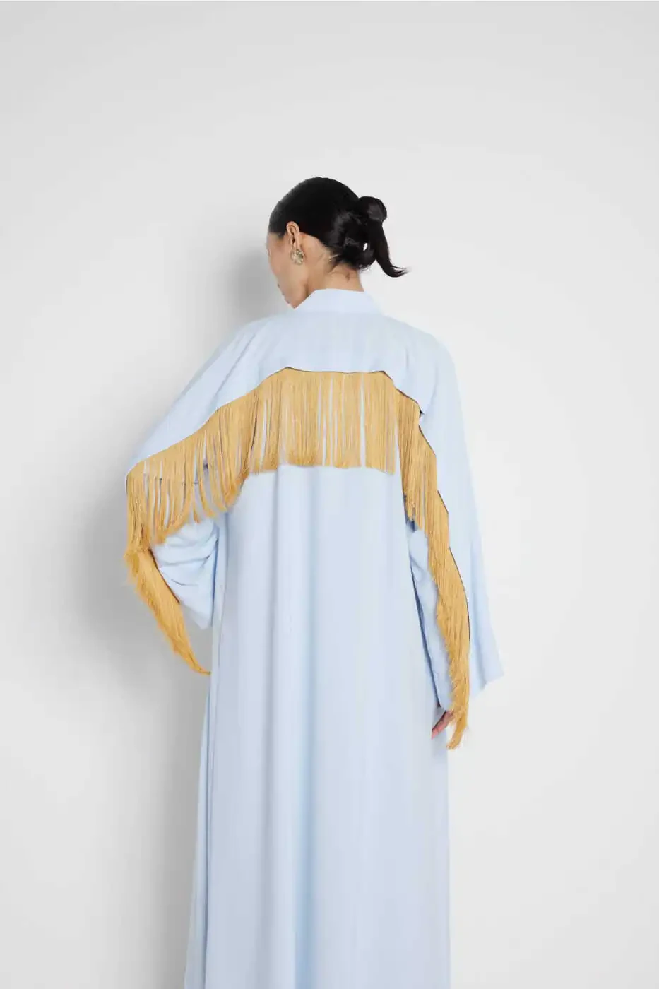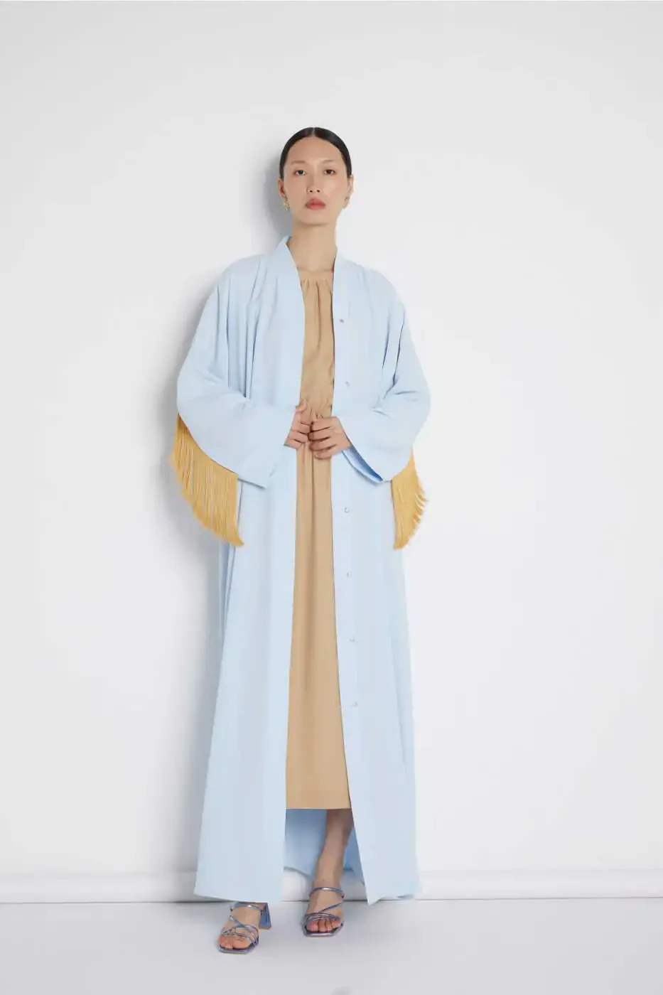 abaya, light blue abaya, tassel abaya, stylish abaya, graceful abaya, comfortable abaya, women abaya, islamic clothing, muslim clothing