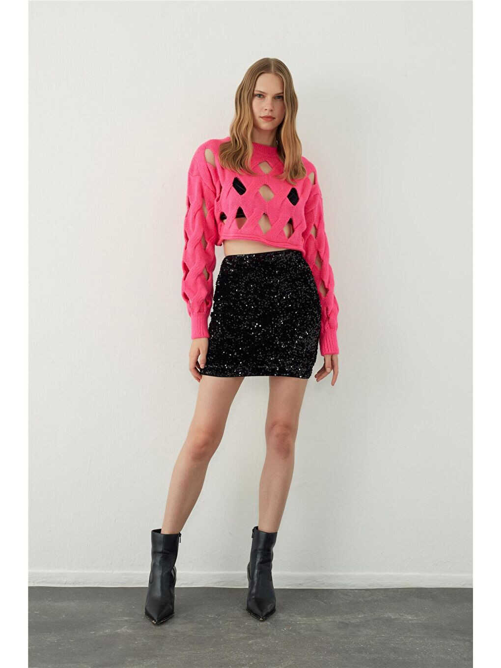 The fuchsia oversize holey knit crop sweater, combining style and comfort, is set to become your new wardrobe staple!