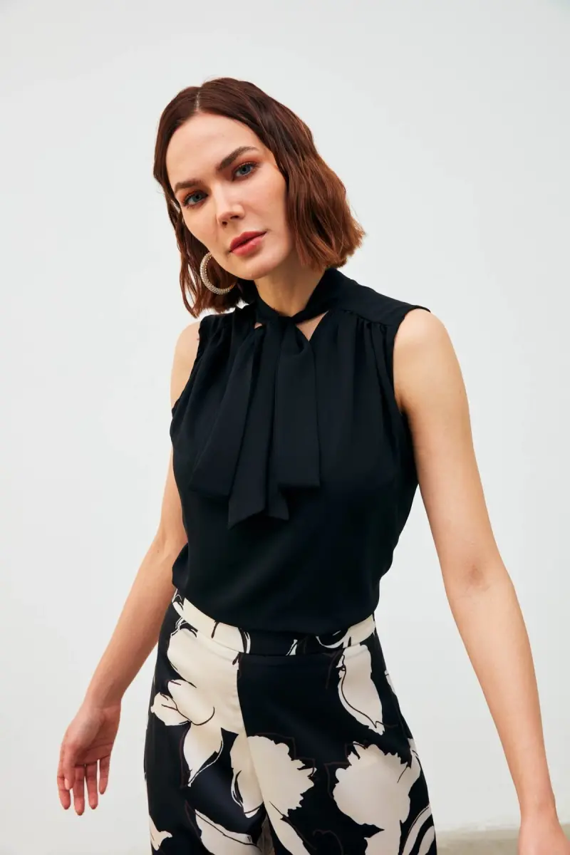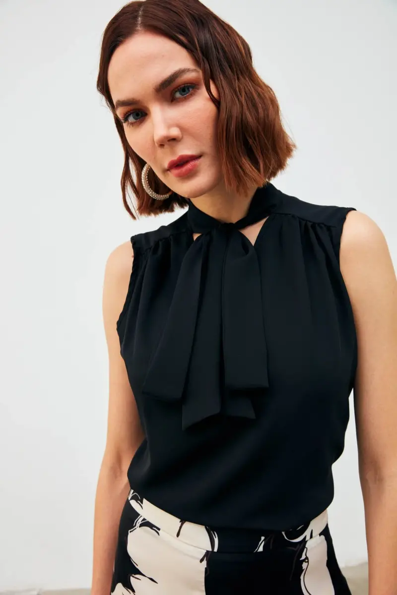 Yumuşak ve nefes alabilen kumaştan üretilen bu bluz, gün boyu konforlu bir kullanım sunar. Siyah rengi ile her türlü kombininize uyum sağlayabilen Fularlı Kolsuz Bluz, günlük kullanımda, özel davetlerde ve iş hayatında tercih edebileceğiniz şık bir seçenektir.