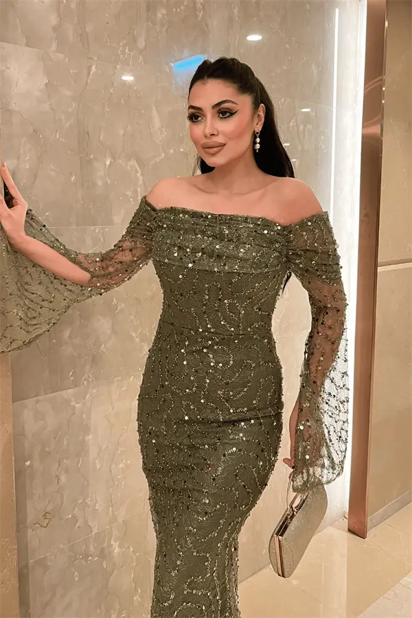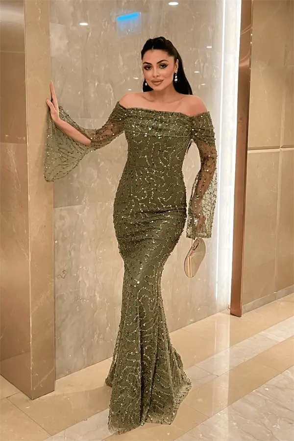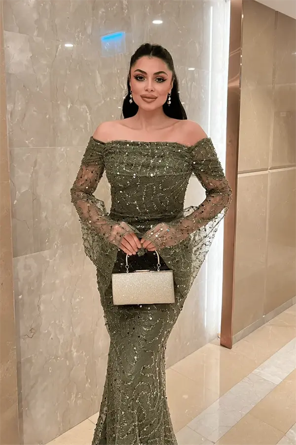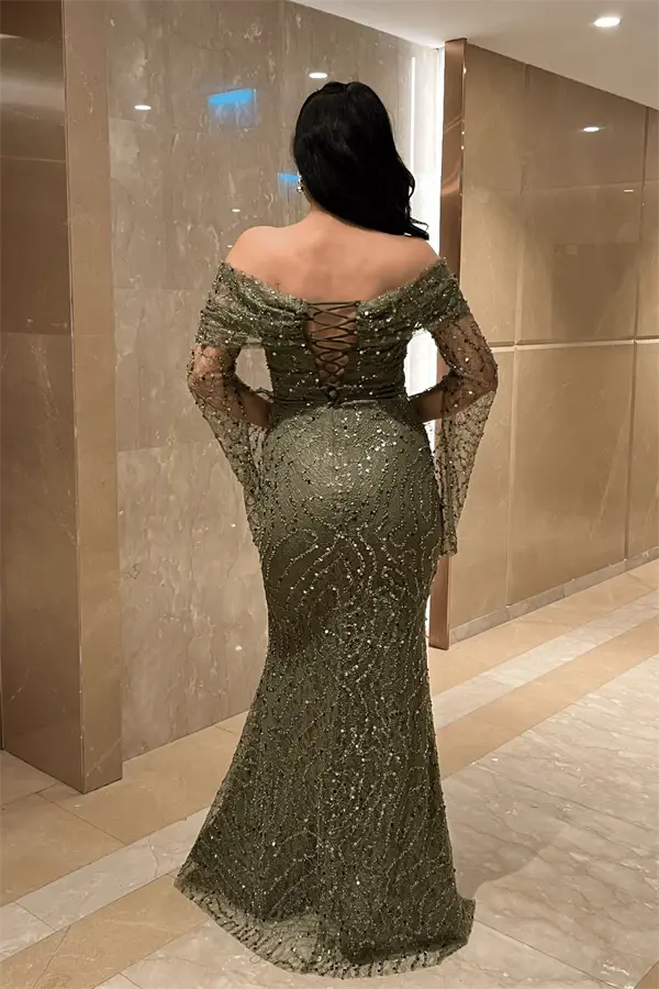 Full Boncuklu Kumaş Kayık Yaka Abiye Elbise - HAKİ YEŞİLİ