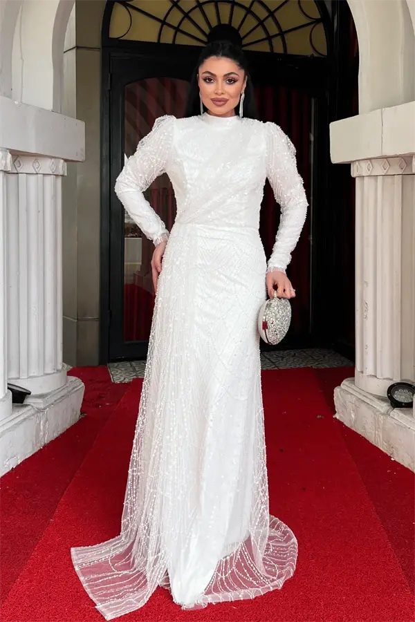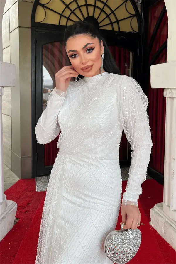 Full Boncuklu Tesettür Elbise - BEYAZ