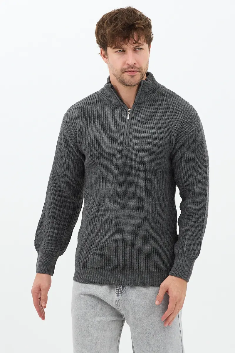 Füme Erkek Oversize Fermuarlı Balıkçı Triko Kazak-Mat Füme