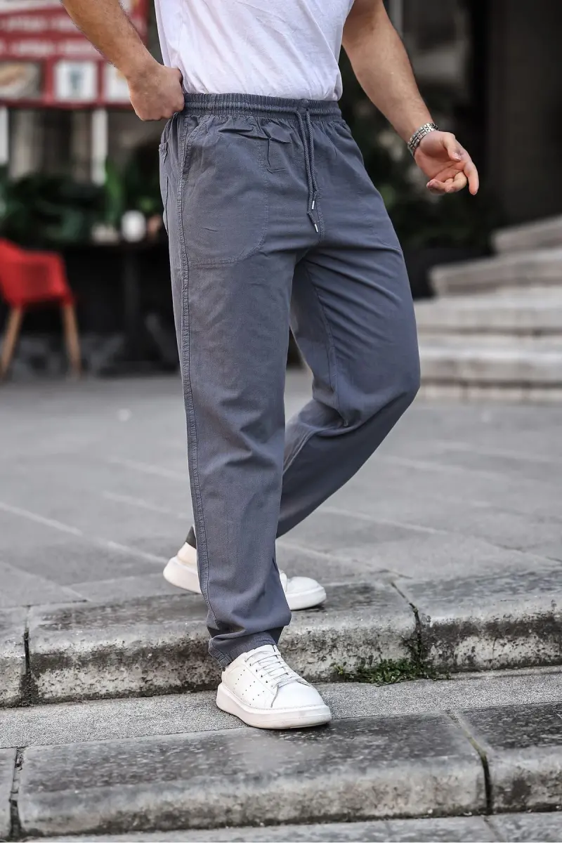 Füme Renk Erkek Yazlık Keten Karışımı Relaxed Pantolon ile yazın keyfini çıkarın!