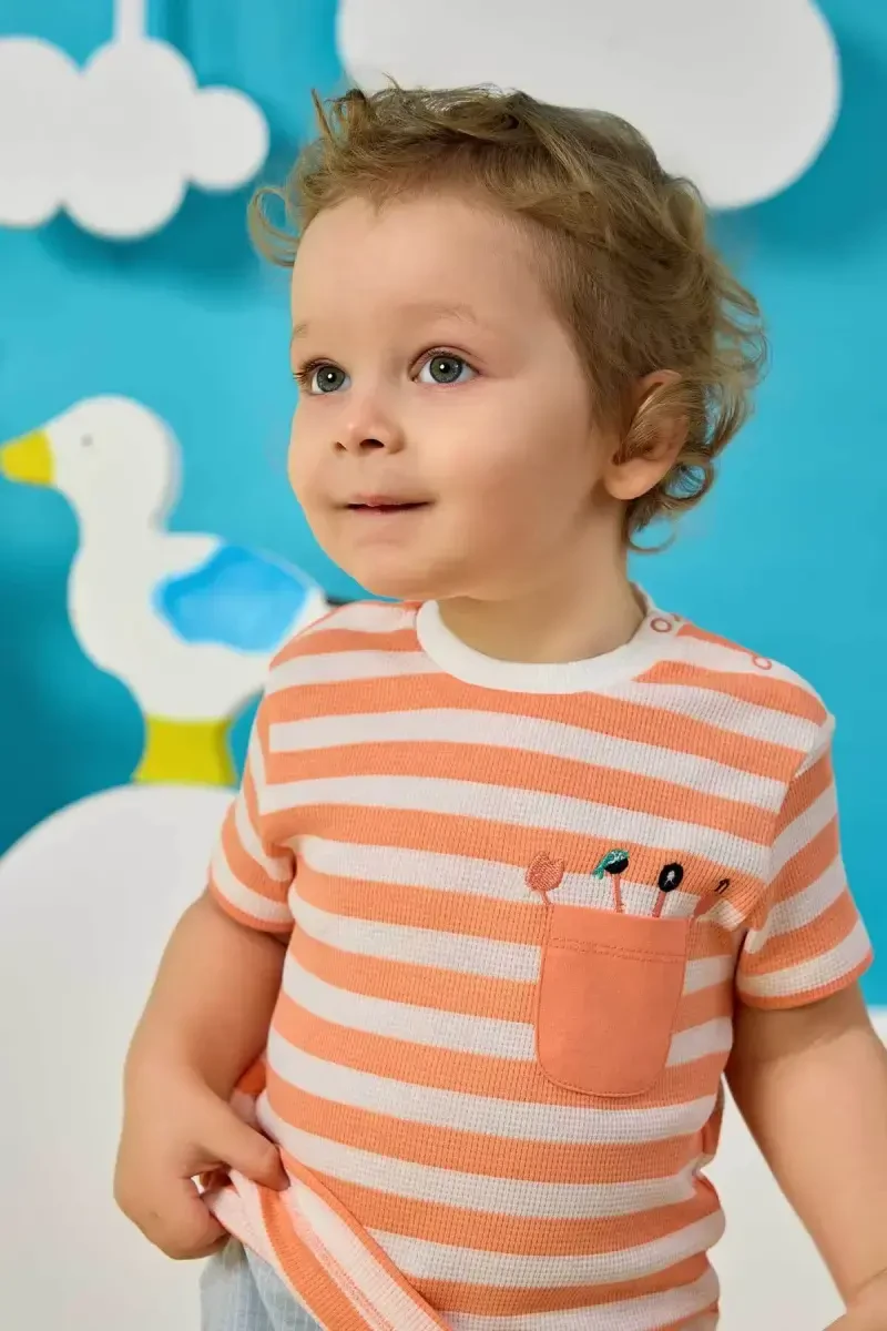 Добавьте энергии в гардероб вашего малыша с мужской футболкой! Эта стильная и удобная футболка поставляется к вам домой с гарантией от [page="merchant_info"]t-mor Kids[/page]. Эта футболка, привлекающая внимание яркостью оранжевых и белых полос, идеально сочетается с шортами и бриджами вашего ребенка. Благодаря короткому рукаву она станет незаменимой вещью в летние месяцы. Круглый вырез и две застежки-кнопки на левом плече делают процессы одевания и раздевания намного более практичными и быстрыми. Деталь с застежкой-кнопкой облегчает смену одежды, особенно для подвижных детей, что облегчает жизнь матерям и отцам. Карман на левой груди футболки добавляет ей шика. Эта футболка, изготовленная из смеси 50% хлопка и 50% полиэстера с учетом чувствительной кожи малышей, обеспечивает удобство ношения и долговечность. Изготовлена из качественных и натуральных материалов, не наносящих вреда коже вашего ребенка. Эта футболка, идеально подходящая для повседневного использования, не ограничивает свободу движений вашего ребенка и позволяет ему чувствовать себя комфортно в течение всего дня. Кроме того, покупая этот продукт, вы также можете воспользоваться возможностью бесплатного возврата в течение 15 дней, предлагаемой Trendyol. Для получения подробной информации [page="return_conditions"]нажмите[/page]. Если вы заботитесь о стиле своего ребенка и хотите подарить ему комфортное ношение, то эта футболка идеально вам подойдет! Сделайте заказ, пока товар не закончился, и обогатите гардероб вашего ребенка этой особенной вещью. Эта футболка производства Minycenter станет одной из любимых вещей в гардеробе вашего ребенка.