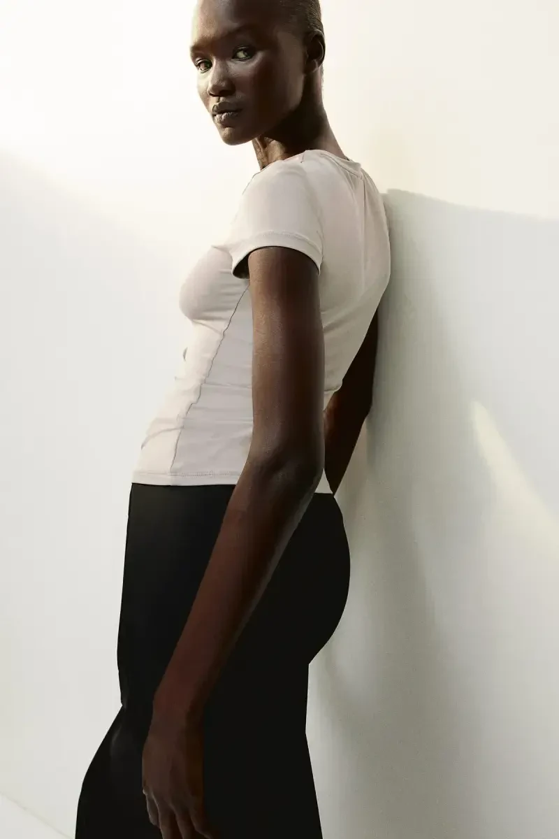 95% хлопок, 5% эластан. Круглый вырез. Длинные рукава. Облегающий крой.
