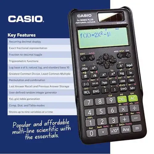 FX-300ESPLS2-SA-IT, doğal ders kitabı gösterimine sahip olan, kesirler, türevler, integraller, toplamlar ve diğer işlemleri, tıpkı matematik ders kitaplarındaki gibi görüntülemenizi sağlar. Standart form ile ondalık sayılar arasında dönüştürme yapma, önceki girdileri gözden geçirme/düzenleme, rastgele sayı üreteci gibi özelliklere sahiptir. 2 fonksiyonlu değerler tablosu [f(x), g(x)], istatistikler ve doğrusal regresyon, kalanlı tam sayı bölümü, rastgele sayı üreteci ve kalanlı tam sayı bölümü, en büyük ortak bölen, en küçük ortak kat gibi pek çok işlevi yerine getirebilir.
