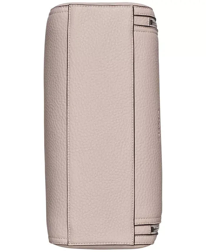 Calvin Klein's medium Garnet tote is designed with plenty of interior room for your day-to-day needs. Medium-sized bag; 12-1/2"W x 9-1/2"H x 4-1/2"D (width is measured across the bottom of handbag); 2 lbs. approx. weight Silhouette is based off 5'9" model 5-1/2"L handles; 23"L adjustable, removable crossbody strap Zipper closure Silver-tone exterior hardware, back slip pocket and 2 side zip pockets Interior zip middle compartment, zip pocket, 2 slip pockets Dust bag included Tablet compatible (std. size 8"-10") Body & trim: polyurethane; lining: polyester Spot clean Imported