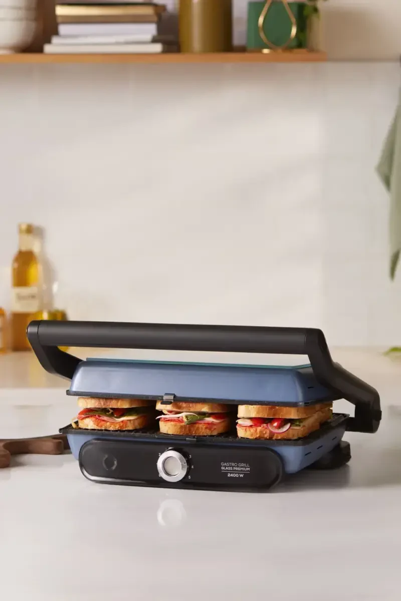 Get ready to experience a feast of flavor in your kitchen with the Gastro Grill Glass Premium 2400w Toaster and Grill Ocean Wave-Blue! This stylish and powerful device allows you to prepare your toasts to perfection and takes your grilling pleasure to a whole new level. Adding a fresh touch to your kitchen with its Ocean Wave-Blue color, the Gastro Grill Glass Premium is not just a kitchen appliance, but also a style statement.Thanks to its 2400W power, the Gastro Grill Glass Premium heats up quickly and efficiently, saving you time. Whether you're making crispy toasts or delicious grills, this machine is equipped to meet all your needs. Thanks to the adjustable temperature control, you can easily set the ideal cooking temperature for different foods. This feature allows you to cook your meats exactly as you want, grill your vegetables without losing their vitamins, and toast your toasts to a golden color without burning them.One of the most striking features of the Gastro Grill Glass Premium is its high-quality glass lid design. This transparent lid allows you to observe the cooking process, so you can easily track when your food is ready. The glass lid also retains heat inside, providing faster and more efficient cooking. In addition, the removable and non-stick plates make cleaning very practical. You can easily remove the plates and wash them in the dishwasher or quickly clean them by hand.The Gastro Grill Glass Premium not only makes toast and grills, but also allows you to try different recipes. You can easily prepare panini, sandwiches, hamburgers, chicken, fish, vegetables and many more foods with this machine. You can discover different flavors by using your creativity and prepare unforgettable meals for your family and loved ones.The Gastro Grill Glass Premium also stands out with its safe use features. Heat-resistant handles protect your hands from burning during cooking. Non-slip feet ensure that the machine stays stable on the counter. Overheat protection ensures that the machine works safely and automatically shuts off in case of any danger.Adding elegance to your kitchen with its Ocean Wave-Blue color, the Gastro Grill Glass Premium is not just a kitchen appliance, but also offers a lifestyle. While enjoying preparing healthy and delicious meals, you can also increase the aesthetics of your kitchen. This machine will be indispensable in your kitchens with its practical and stylish design.