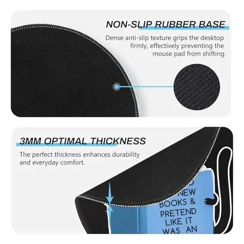 Witty Design with Reinforced Edge: Showcases the humorous book-lover quote and cute cat art, finished with a precision-stitched border that prevents fraying for long-lasting use as unique office decor High-Performance Glide & Grip: Features a smooth, textured surface for accurate tracking with all mice, paired with a high-density rubber backing that grips desks firmly during work or gaming sessions Ideal Portable Size & Shape: The 8.6-inch round form is perfectly sized as a small mouse pad for laptops, making it a compact and portable desk accessory for home, office, or travel use Durable & Easy-Clean Material: Crafted from a durable fabric blend that resists fading, with a water-resistant surface that can be easily wiped clean to maintain its like-new appearance The Perfect Gift of Personality: An exceptional gift that combines humor and function, ideal for book lovers, cat lovers, coworkers, friends, teachers, or as a Christmas or birthday present for women and men