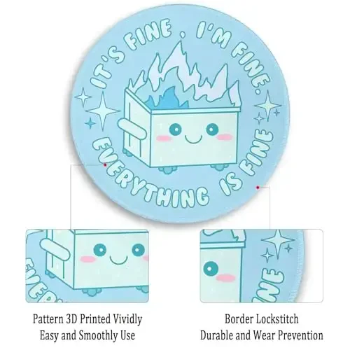 Add a fun and quirky touch to your workspace with the Gctriki Dumpster on Fire Mouse Pad. This adorable light blue round mouse pad will become an indispensable part of your desk. The funny burning dumpster design with the theme "It's Fine I'm Fine Everything is Fine" will make you and those around you smile. Especially on busy and stressful days, this mouse pad will lift your spirits and bring a positive vibe to your work environment. The Gctriki Dumpster on Fire Mouse Pad is not just a fun accessory, but also a high-performance tool. The high-quality Lycra fabric surface ensures your mouse glides seamlessly, allowing you to make precise and accurate movements. Whether you're working in the office or gaming at home, this mouse pad offers you a superior experience. With a diameter of 8.66 inches and a thickness of 0.12 inches, this mouse pad has ideal dimensions, is lightweight, and easily portable. Thanks to its soft and foldable structure, it doesn't take up much space in your bag or suitcase. Whether you're at home, in the office, or traveling, the Gctriki Dumpster on Fire Mouse Pad can always be with you. Its natural rubber base is non-slip and fits perfectly on all surfaces. You can safely use it on different surfaces such as glass, wood, and metal. Its stitched edges make it durable and resistant to wear and tear. This mouse pad is a great gift option not only for yourself but also for your loved ones. It can be the perfect surprise for women, men, teachers, family members, friends, colleagues, and managers on special occasions such as Christmas, Thanksgiving, Valentine's Day, Mother's Day, Father's Day, Easter, or birthdays. The vividly printed patterns with creative art design never fade and always look like new. Choose the Gctriki Dumpster on Fire Mouse Pad to personalize your desk and create a fun atmosphere. With this mouse pad, you will both have a comfortable user experience and add a unique touch to your work environment. Thanks to its quality materials and careful workmanship, it is a product that you can enjoy for many years.