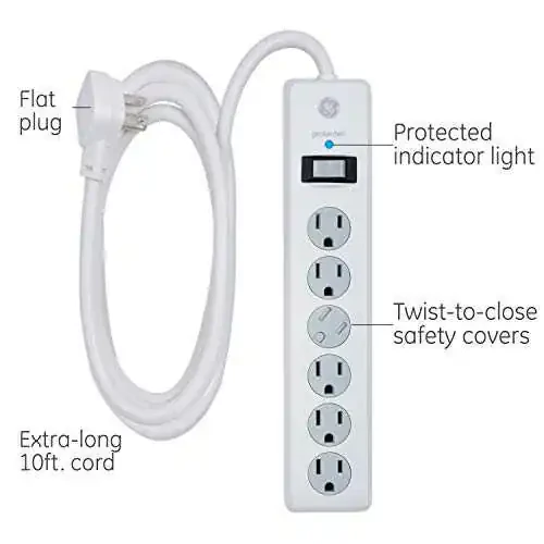 GE 6 chiqishli oqim himoyachisi qimmatbaho elektron qurilmalaringizni to'satdan oqim sakrashlaridan va kuchlanish o'zgarishidan himoya qilish uchun mo'ljallangan ishonchli va qulay yechim hisoblanadi. 10 futli uzatma simi bilan qurilmalaringizni kerakli joyga joylashtirish erkinligiga egasiz. 800 Joule himoya quvvati kompyuterlar, televizorlar, o'yin konsollari va boshqa sezgir elektron qurilmalarni oqim sakrashlaridan samarali himoya qiladi.