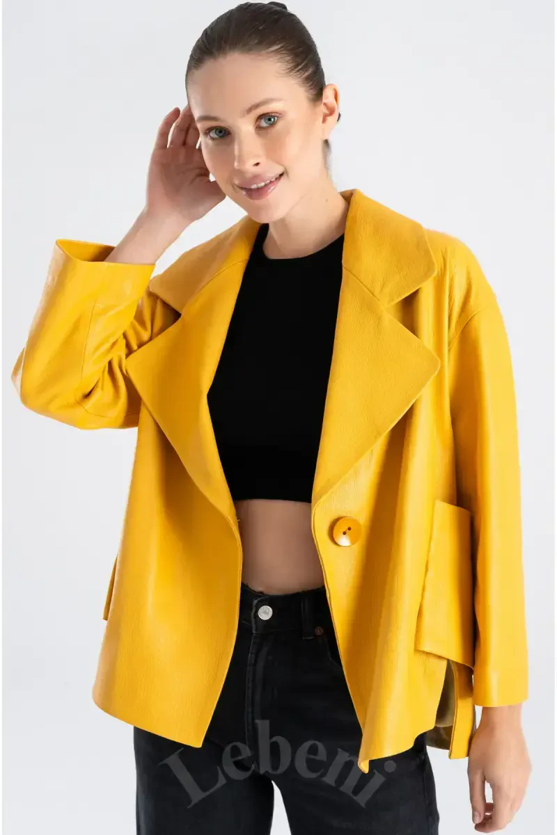 Genuine Leather Jacket Women - Single Button Oversize Seasonal Yellow Leather Jacket Women is a timeless piece that reflects the stylish stance of the modern woman. This jacket is made of high-quality genuine leather and offers long-lasting use. The natural structure of the leather allows the jacket to become more beautiful with each use. The vibrant yellow color adds energy to every combination, allowing you to stand out from the crowd. The oversize cut offers a comfortable use while creating a trendy look. The single button detail elegantly closes the front of the jacket, creating a chic silhouette. Thanks to its seasonal design, you can easily use it in spring and autumn. The inner lining increases the comfort of the jacket, while the durability of the outer surface ensures that it will be in your wardrobe for many years. This jacket is not just a garment, but also a form of expression. It is an ideal choice for women who want to reflect their own style and make a difference. Whether you make a sporty combination with jeans or combine it with a stylish dress to attend a special invitation, this jacket will always complete your style. The quality of genuine leather, the energy of the yellow color and the modernity of the oversize cut come together to make this jacket unique. It is a timeless investment that should definitely be in your closet. It is known that yellow color psychologically gives happiness and energy. When you wear this jacket, you will feel not only stylish but also more positive and energetic. This jacket is a perfect choice to feel good and reflect your style. Thanks to its oversize cut, it adapts to different body types and offers a comfortable use. The single button detail increases the elegance and grace of the jacket, while also allowing you to put it on and take it off easily. The genuine leather material increases the durability of the jacket while preventing sweating with its breathable structure. The inner lining softens its contact with your skin and provides comfort throughout the day. This jacket will not only enhance your appearance, but also increase your self-confidence. This jacket, which offers elegance, comfort and quality together, is a candidate to be the most valuable piece of your wardrobe. This jacket, which is carefully designed in every detail, will add a unique touch to your style.