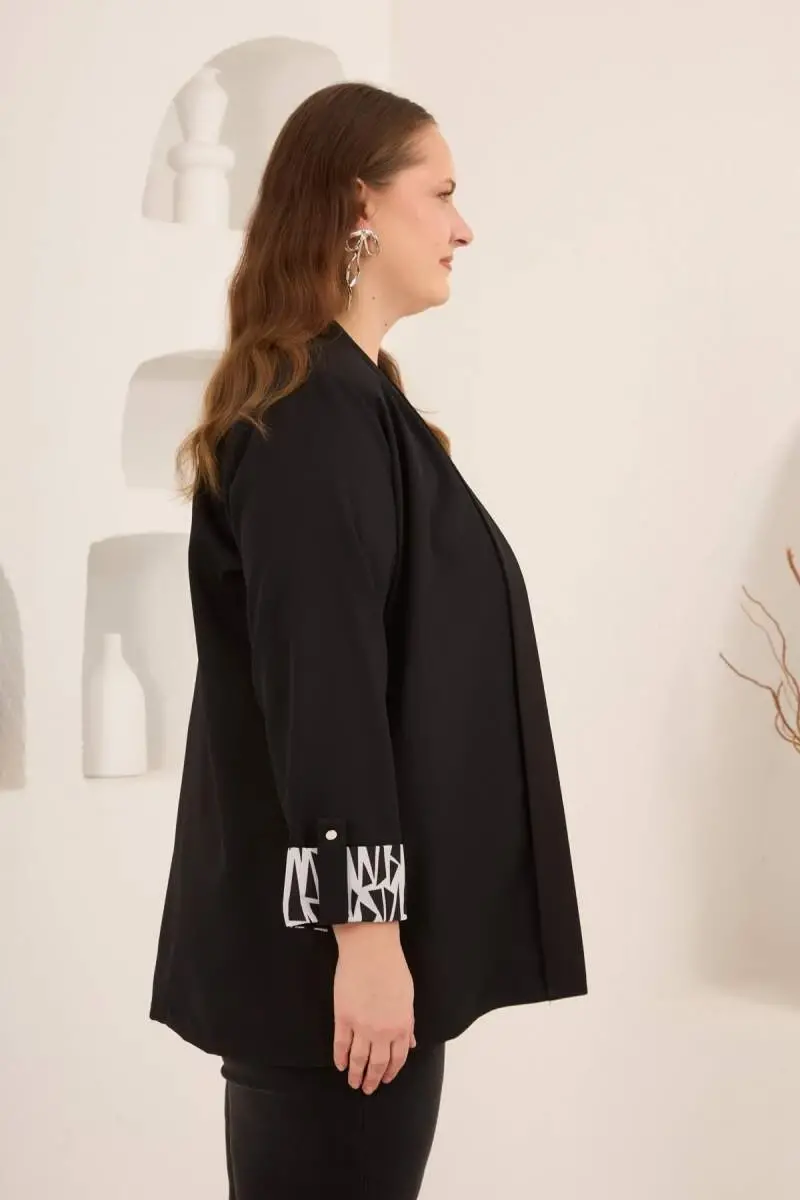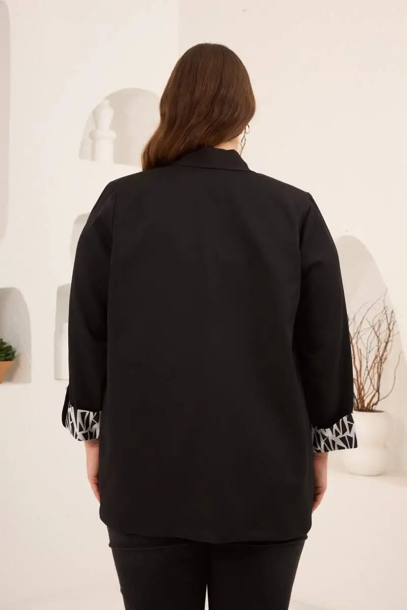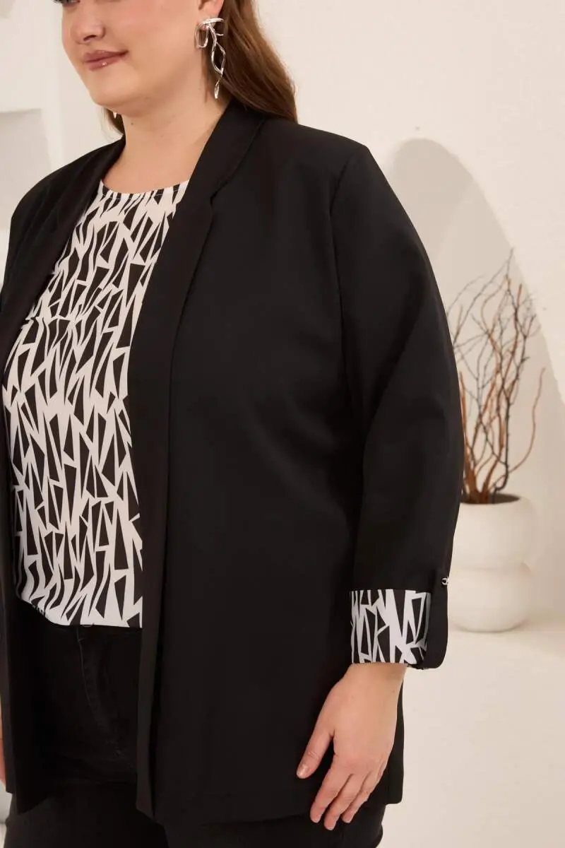 Geometrik Desenli Kadın Büyük Beden Atlet Ceket Takım Siyah
