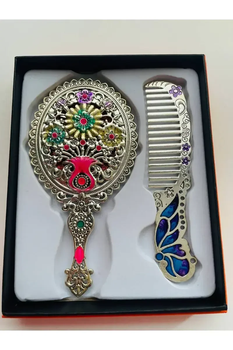 Gift Mirror Comb Set, Floral, Metal, 15x12-Colorful. Made of metal material. It has a floral pattern. It consists of 2 pieces, a mirror and a comb. Mirror Size: 15x12 cm. It will be sent in mixed colors.