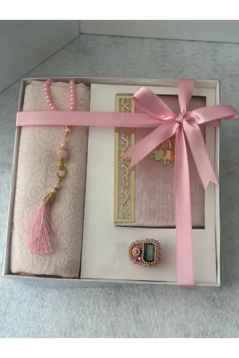 **Product Description:** Present your loved ones with a meaningful and elegant gift with the "Gift Prayer Rug Set - Pink," which holds a special place among Islamic gifts. This unique set will accompany you in your daily prayers and add an aesthetic touch to your home with its stylish design. The carefully designed pink color creates a peaceful and warm atmosphere, while each piece in the set has been meticulously selected for quality and usability. You can consider this set as a spiritual investment for yourself, as well as a gift for your loved ones, making it an unforgettable gesture for special occasions. It is a perfect option for weddings, engagements, Mawlids, or just to say "I felt like it." This set is not just a gift, but also an expression of love, respect, and spiritual values.This special set is made of high-quality materials and offers long-lasting use. The prayer rug makes your prayers more comfortable with its soft texture, while the rosary helps you perform your dhikr regularly. The scent sachet adds a different dimension to your prayers with its refreshing and pleasant scent. The entire set is presented in a stylish box, providing the recipient with an unforgettable experience when given as a gift. The elegance of the pink color and the harmony of the pieces in the set distinguish this set from other gifts and make it special. Whether for a newly married couple or a friend who values spiritual values, this set will make everyone happy. As the importance of spiritual values increases day by day, such meaningful gifts strengthen the bond between us and our loved ones and show them the value we place on them. Create a special place in the hearts of your loved ones by offering them a useful and spiritually valuable gift with the "Gift Prayer Rug Set - Pink." This set is not just an object, but also an expression of love and respect. This set, which will make your prayers more meaningful and peaceful, will also add elegance to your home decoration. The "Gift Prayer Rug Set - Pink" is the perfect choice to make your loved ones happy on special occasions and give them an unforgettable gift. This set is not just a gift, but also a symbol of friendship and love.