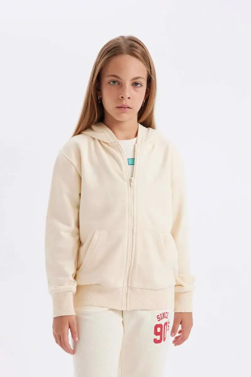 Girls Basic Plain Hooded Zippered Pocket School Cardigan C8110A824AU-Ecru
