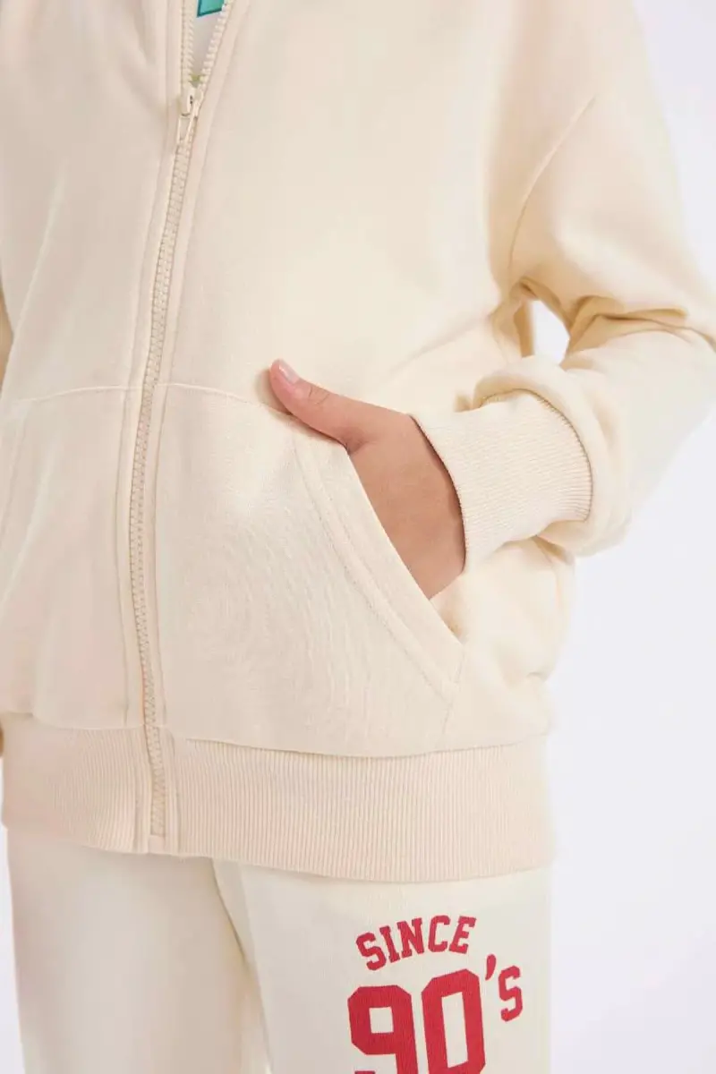 Made from cotton-blend sweatshirt fabric. It is a hooded, long-sleeved, zippered and pocketed model. It is a basic model.