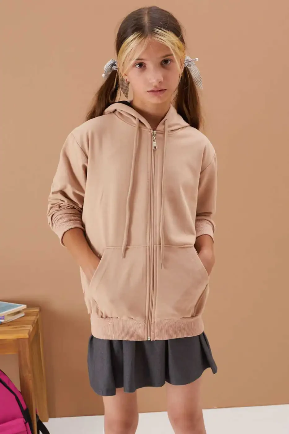 With the Girls Hooded Zippered Beige School Cardigan 16193, your daughters can go to school stylishly and comfortably every day. Order now and make your little girls' days more enjoyable!