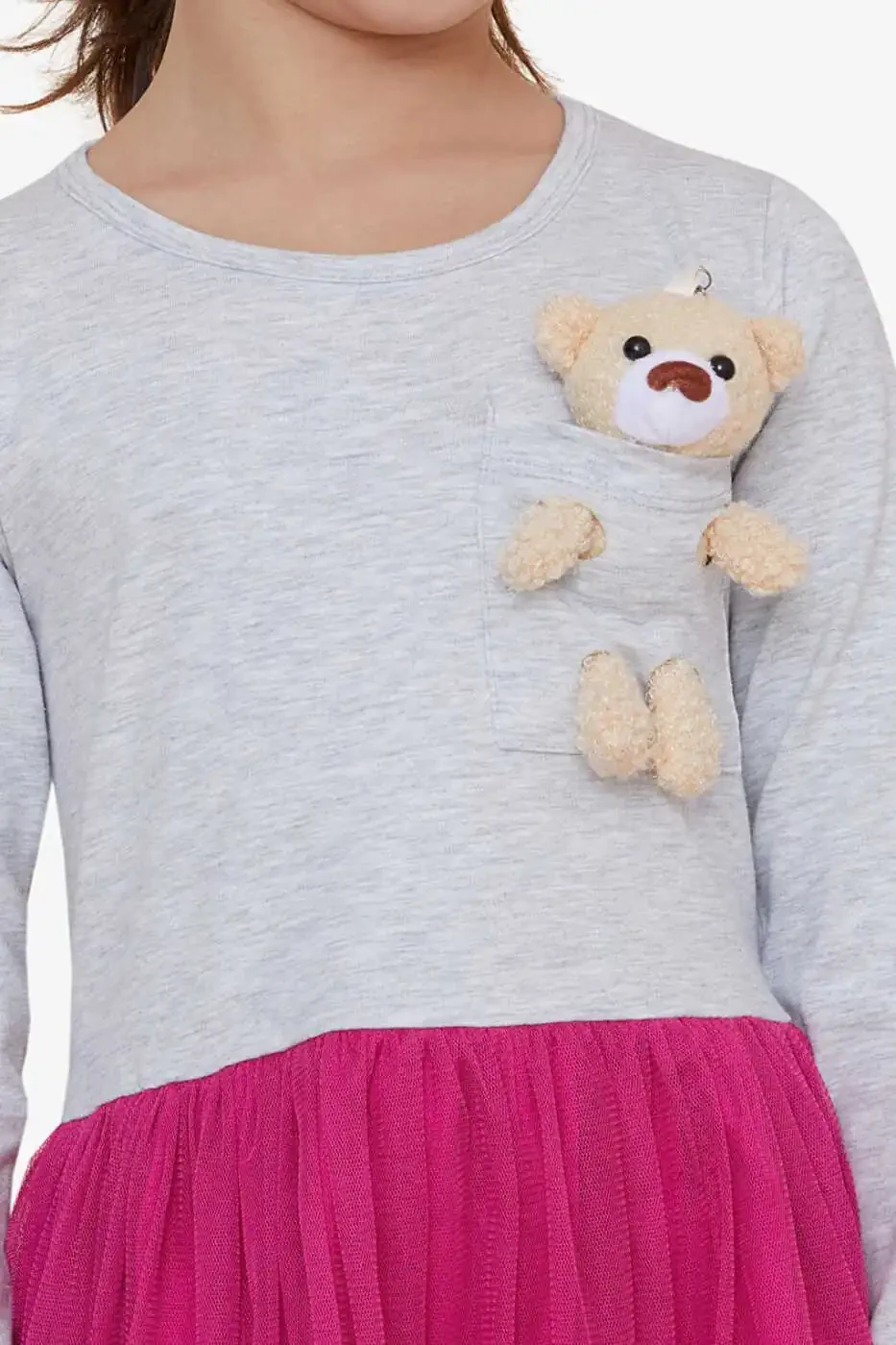 This long-sleeved dress, perfect for a sweet and comfortable look in your little princess's daily life, combines comfort and style with its soft light gray melange fabric. The cute bear accessory adds a sweet touch to the dress, while the long sleeves help keep your child cool. The dress's relaxed fit allows for freedom of movement, ensuring your child stays comfortable all day long.