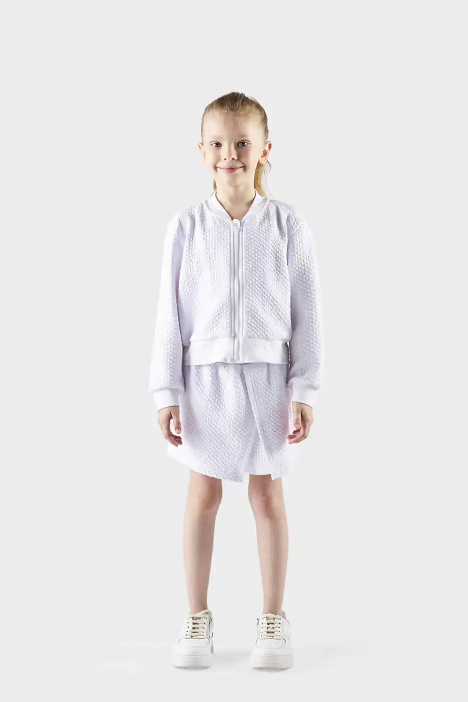 Girls' sweatshirt, zippered sweatshirt, white sweatshirt, textured sweatshirt, children's clothing, girls' clothing, comfortable sweatshirt, stylish sweatshirt, modern sweatshirt, children's fashion