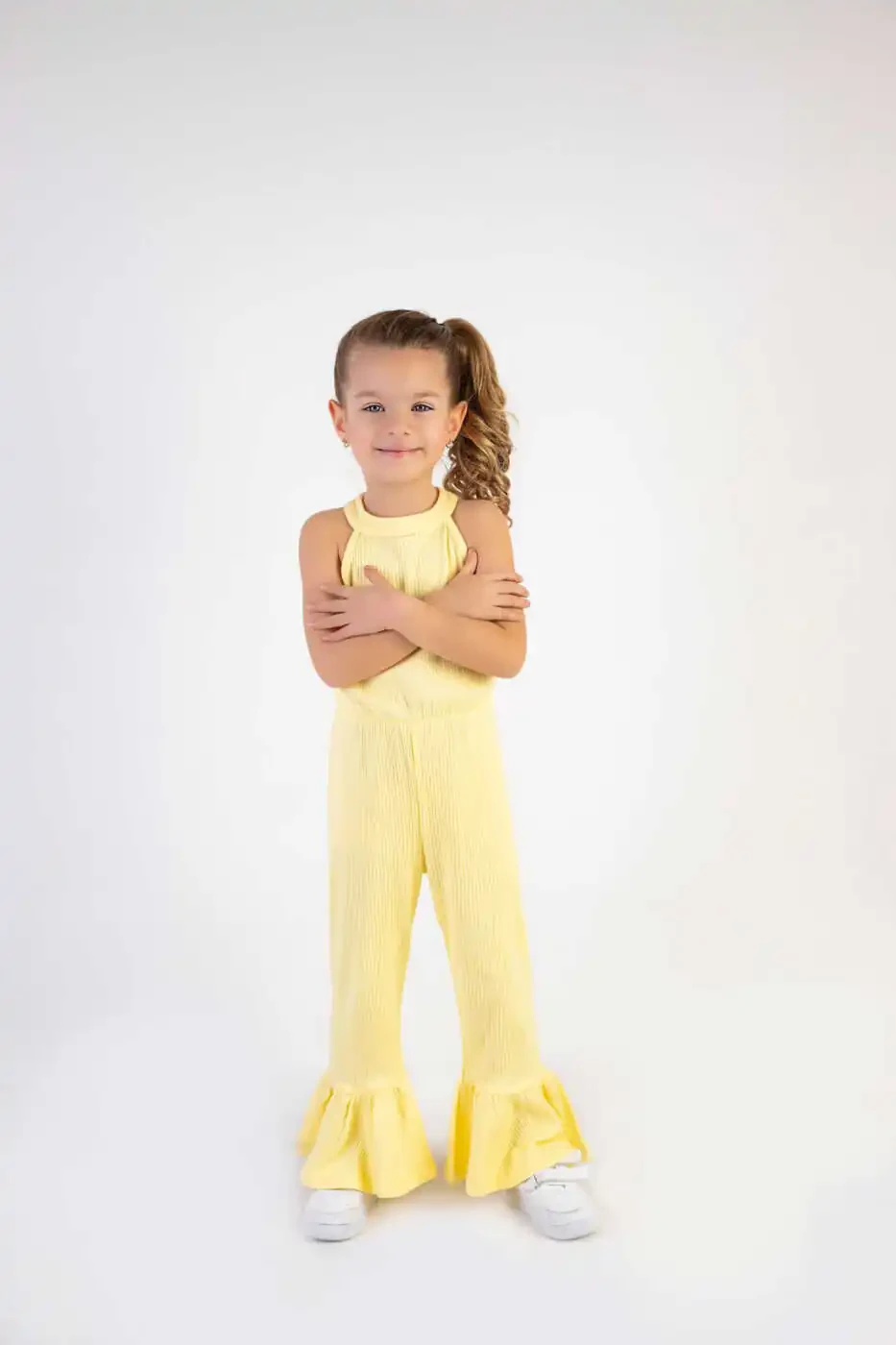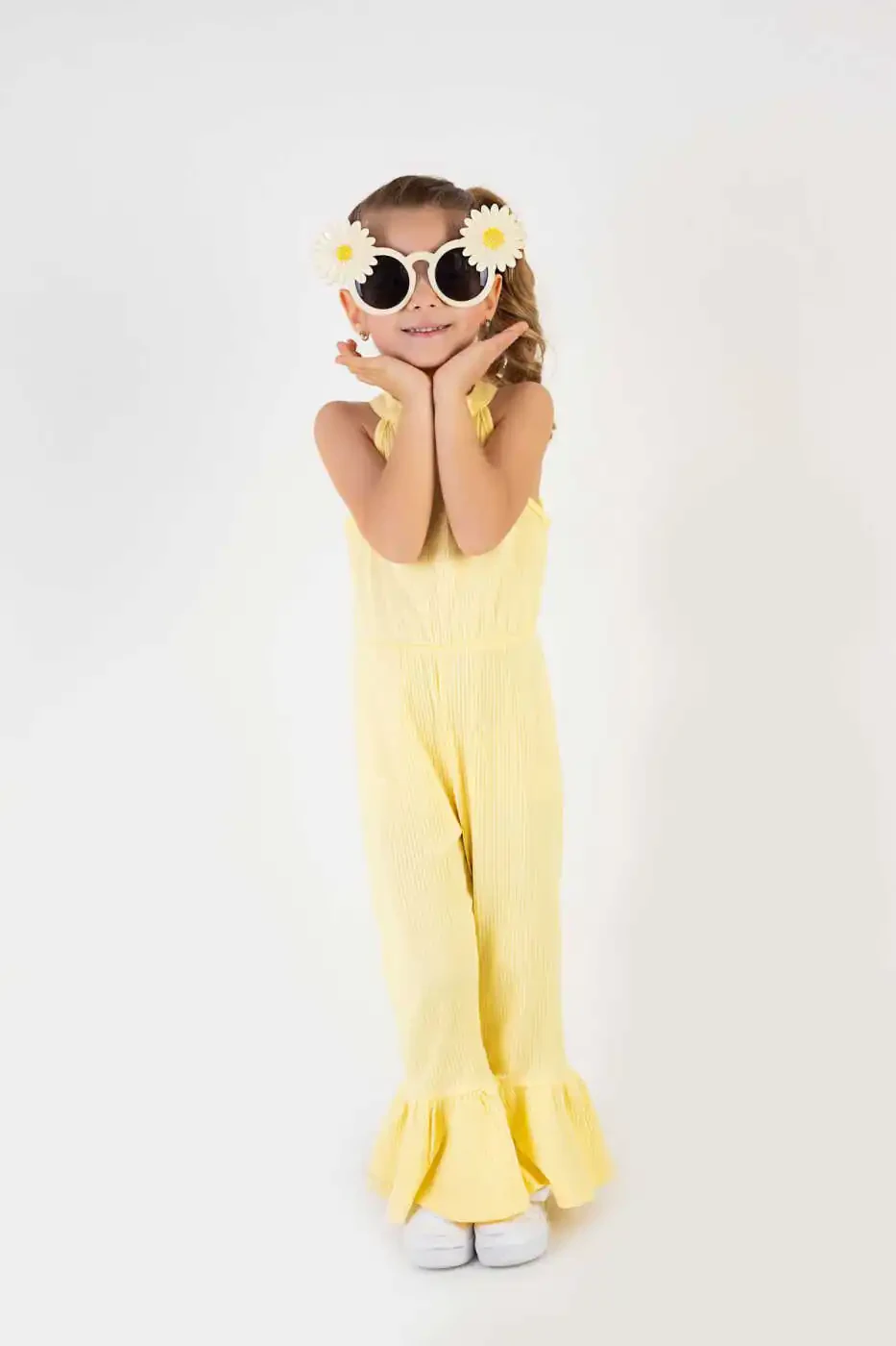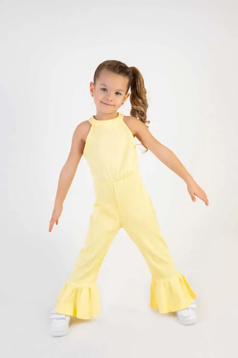 A basic summer jumpsuit made of thin knit fabric, perfect for keeping your little girls cool and stylish during hot summer days. This jumpsuit with its eye-catching neck and leg details offers a breathable and comfortable wear thanks to its cotton composition.