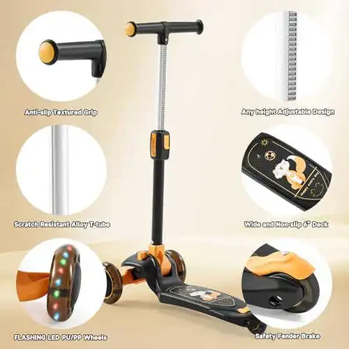 The GLAMUP Kids Kick Scooter is designed to provide a fun and adventurous experience for children aged 3-14. Its light-up wheels, adjustable handlebar, and lean-to-steer system offer a safe and enjoyable ride for kids. Additionally, its easy-folding mechanism ensures easy transportation and storage.
